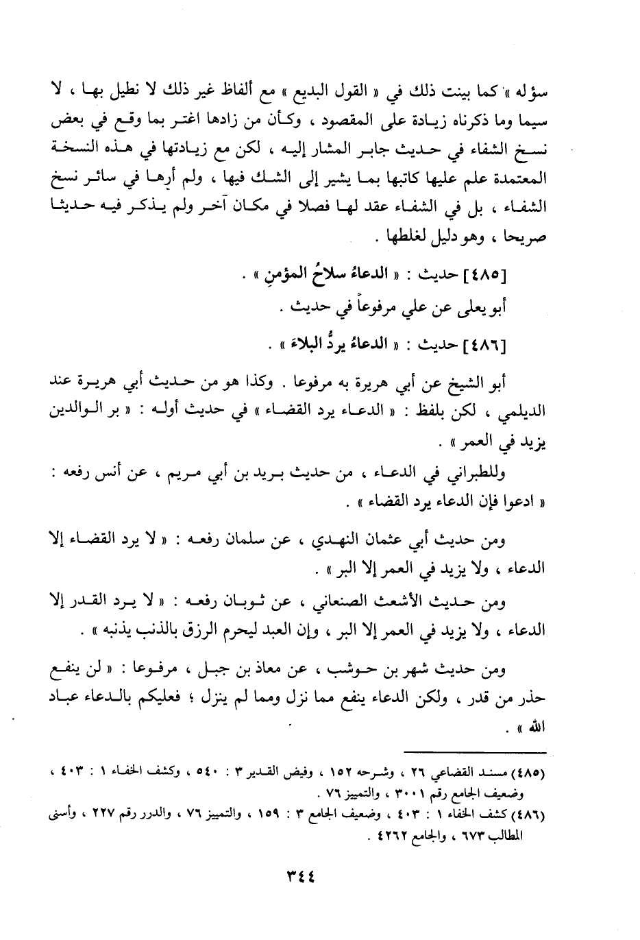 486 - حَدِيث: الدُّعَاءُ يَرُدُّ الْبَلاءَ، أبو الشيخ عن أبي هريرة به مرفوعا، وكذا هو من حديث أبي هريرة عند الديلمي لكن بلفظ: الدعاء يرد القضاء في حديث أوله: بر الوالدين يزيد في العمر، وللطبراني في الدعاء من حديث بريد بي أبي مريم عن أنس رفعه: ادعوا فإن الدعاء يرد القضاء، ومن حديث أبي عثمان النهدي عن سلمان رفعه: لا يرد القضاء إلا الدعاء، ولا يزيد في العمر إلا البر، ومن حديث الأشعث الصنعاني عن ثوبان رفعه: لا يرد القدر إلا الدعاء، ولا يزيد في العمر إلا البر، وإن العبد ليحرم الرزق بالذنب يذنبه، ومن حديث شهر بن حوشب عن معاذ بن جبل مرفوعا: لن ينفع حذر من قدر، ولكن الدعاء ينفع مما نزل ومما لم ينزل، فعليكم بالدعاء عباد اللَّه،