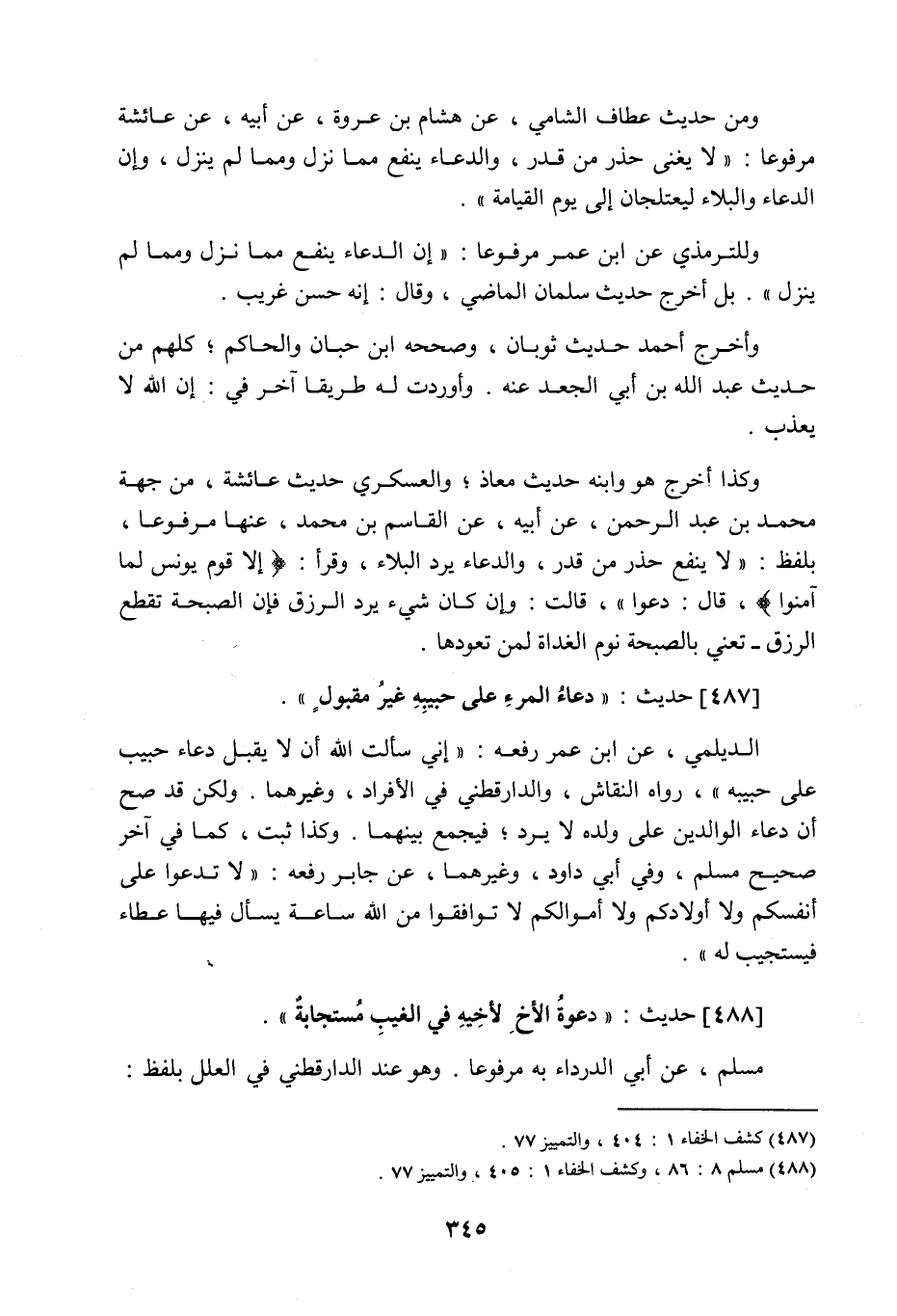 487 - حَدِيث: دُعَاءُ الْمَرْءِ عَلَى حَبِيبِهِ غَيْرُ مَقْبُولٍ، الديلمي عن ابن عمر رفعه: إني سألت اللَّه أن لا يقبل دعاء حبيب على حبيبه، رواه النقاش والدارقطني في الأفراد وغيرهما، ولكن صح أن دعاء الوالدين على ولده لا يرد، فيجمع بينهما، وكذا ثبت كما في آخر صحيح مسلم وفي أبي داود وغيرهما عن جابر رفعه: لا تدعوا على أنفسكم ولا أولادكم ولا أموالكم لا توافقوا من اللَّه ساعة يسأل فيها عطاء فيستجيب له.