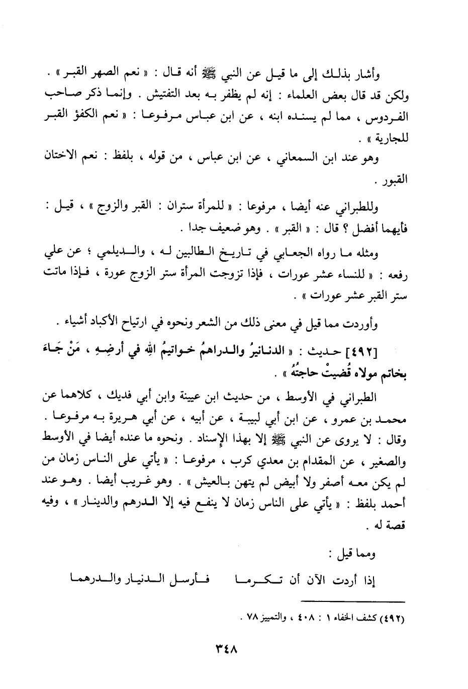 492 - حَدِيث: الدَّنَانِيرُ وَالدَّرَاهِمُ خَوَاتِيمُ اللَّه فِي أَرْضِهِ، مَنْ جَاءَ بِخَاتَمِ مَوْلاهُ قُضِيَتْ حَاجَتُهُ، الطبراني في الأوسط من حديث ابن عيينة وابن أبي فديك، كلاهما عن محمد بن عمرو عن ابن أبي لبيبة عن أبيه عن أبي هريرة به مرفوعا، وقال: لا يروى عن النبي صَلَّى اللَّهُ عَلَيْهِ وَسَلَّمَ إلا بهذا الإسناد، ونحوه ما عنده أيضا في الأوسط والصغير، عن المقدام بن معدي كرب مرفوعا: يأتي على الناس زمان من لم يكن معه أصفر ولا أبيض لم يتهن بالعيش، وهو غريب أيضا، وهو عند أحمد بلفظ: يأتي على الناس زمان لا ينفع فيه إلا الدراهم والدينار وفيه قصة له، ومما قيل: