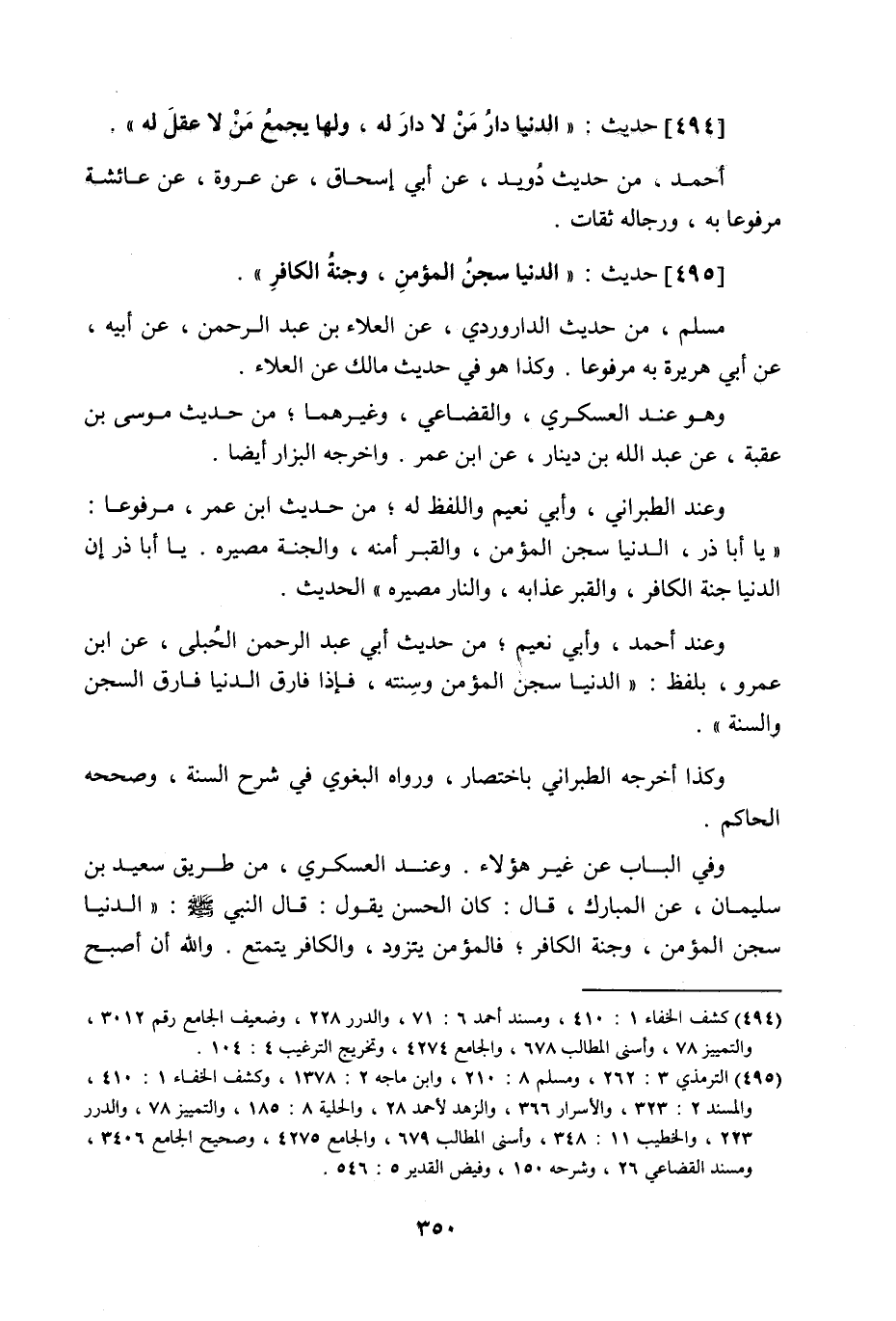 495 - حَدِيث: الدُّنْيَا سجن المؤمن وجتة الْكَافِرِ، مسلم من حديث الدراوردي عن العلاء بن عبد الرحمن عن أبيه عن أبي هريرة به مرفوعا، وكذا هو في حديث مالك عن العلاء، وهو عند العسكري والقضاعي وغيرهما من حديث موسى بن عقبة عن عبد اللَّه بن دينار عن ابن عمر، وأخرجه البزار أيضا وعند الطبراني وأبي نُعيم واللفظ له من حديث ابن عمر مرفوعا: يا أبا ذر! الدنيا سجن المؤمن، والقبر أمنه، والجنة مصيره. يا أبا ذر! إن الدنيا جنة الكافر، والقبر عذابه، والنار مصيره، الحديث، وعند أحمد وأبي نُعيم من حديث أبي عبد الرحمن الحُبلي عن ابن عمرو بلفظ: الدنيا سجن المؤمن وسِنته، فإذا فارق الدنيا فارق السجن والسنة، وكذا أخرجه الطبراني باختصار، ورواه البغوي في شرح السنة، وصححه الحاكم، وفي الباب عن غير هؤلاء، وعند العسكري من طريق سعيد بن سليمان عن المبارك قال: كان الحسن يقول: قال النبي صَلَّى اللَّهُ عَلَيْهِ وَسَلَّمَ: الدنيا سجن المؤمن، وجنة الكافر، فالمؤمن يتزود، والكافر يتمتع، واللَّه إن أصبح