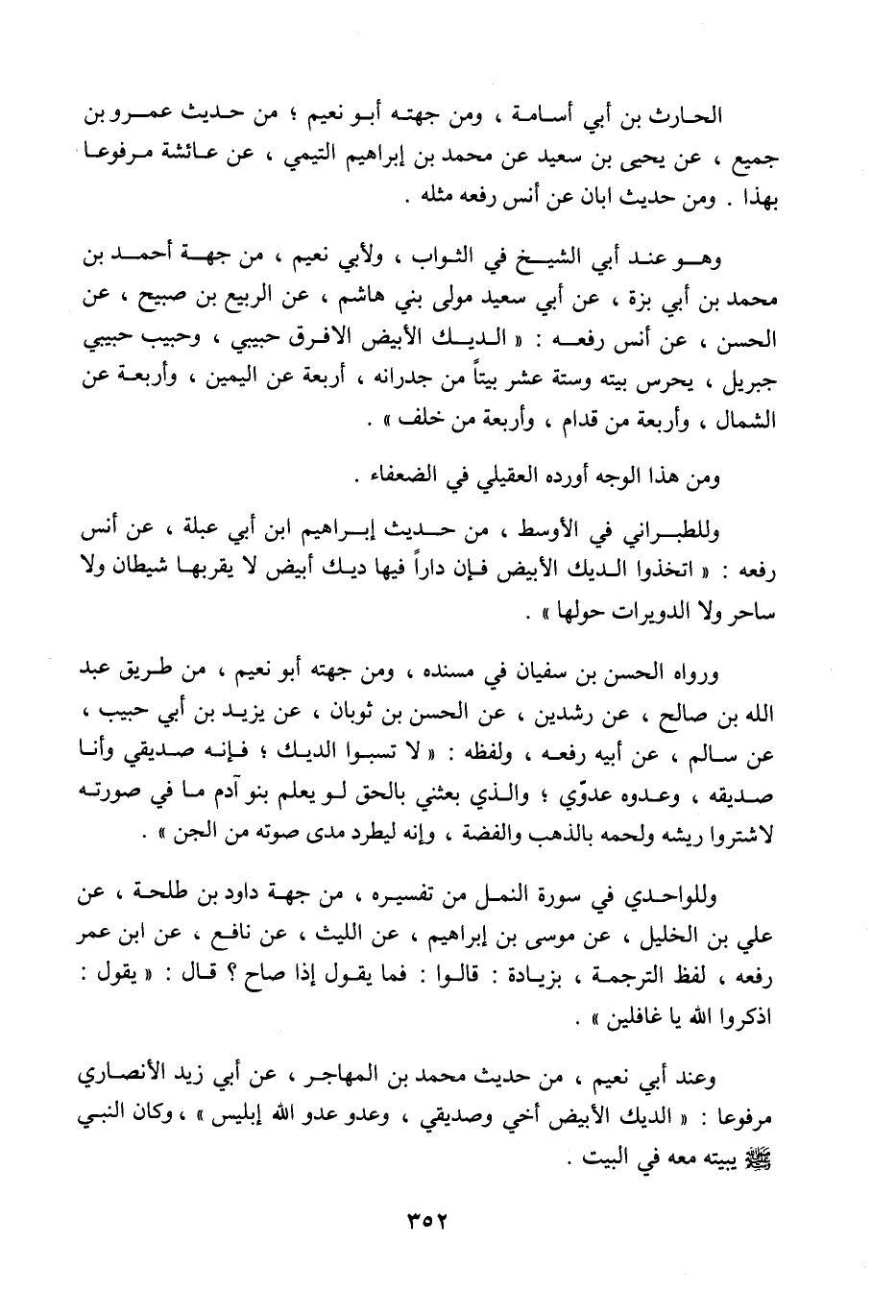 الحارث ابن أبي أسامة، ومن جهته أبو نُعيم من حديث عمرو بن جميع عن يحيى بن سعيد عن محمد بن إبراهيم التيمي عن عائشة مرفوعا بهذا، ومن حديث أبان عن أنس رفعه مثله، وهو عند أبي الشيخ في الثواب، ولأبي نُعيم من جهة أحمد بن محمد ابن أبي بزة عن أبي سعيد مولى بني هاشم عن الربيع بن صبيح عن الحسن عن أنس رفعه: الديك الأبيض الأفرق حبيبي، وحبيب حبيبي جبريل يحرس بيته وستة عشر بيتا من جيرانه، أربعة عن اليمين، وأربعة عن الشمال، وأربعة من قدام، وأربعة من خلف، ومن هذا الوجه أورده العقيلي في الضعفاء، وللطبراني في الأوسط من حديث إبراهيم ابن أبي عبلة عن أنس رفعه: اتخذوا الديك الأبيض، فإن داراَ فيها ديك أبيض لا يقربها شيطان ولا ساحر ولا الدويرات حولها، ورواه الحسن بن سفيان في مسنده ومن جهته أبو نُعيم من طريق عبد اللَّه بن صالح عن رشدين عن الحسن بن ثوبان عن يزيد بن أبي حبيب عن سالم عن أبيه رفعه، ولفظه: لا تسبوا الديك فإنه صديقي، وأنا صديقه، وعدوه عدوّي، والذي بعثني بالحق لو يعلم بنو آدم ما في صوته لاشتروا ريشه ولحمه بالذهب والفضة، وإنه ليطرد مدى صوته من الجن، وللواحدي في سورة النمل من تفسيره من جهة داود بن طلحة عن علي بن الخليل عن موسى بن إبراهيم عن الليث عن نافع عن ابن عمر رفعه بلفظ الترجمة بزيادة: قالوا: فما يقول إذا صاح قال: يقول اذكروا اللَّه يا غافلين، وعند أبي نُعيم من حديث محمد بن المهاجر عن أبي زيد الأنصاري مرفوعا: الديك الأبيض أخي وصديقي وعدو عدو اللَّه إبليس، وكان النبي صَلَّى اللَّهُ عَلَيْهِ وَسَلَّمَ يبته معه في البيت،