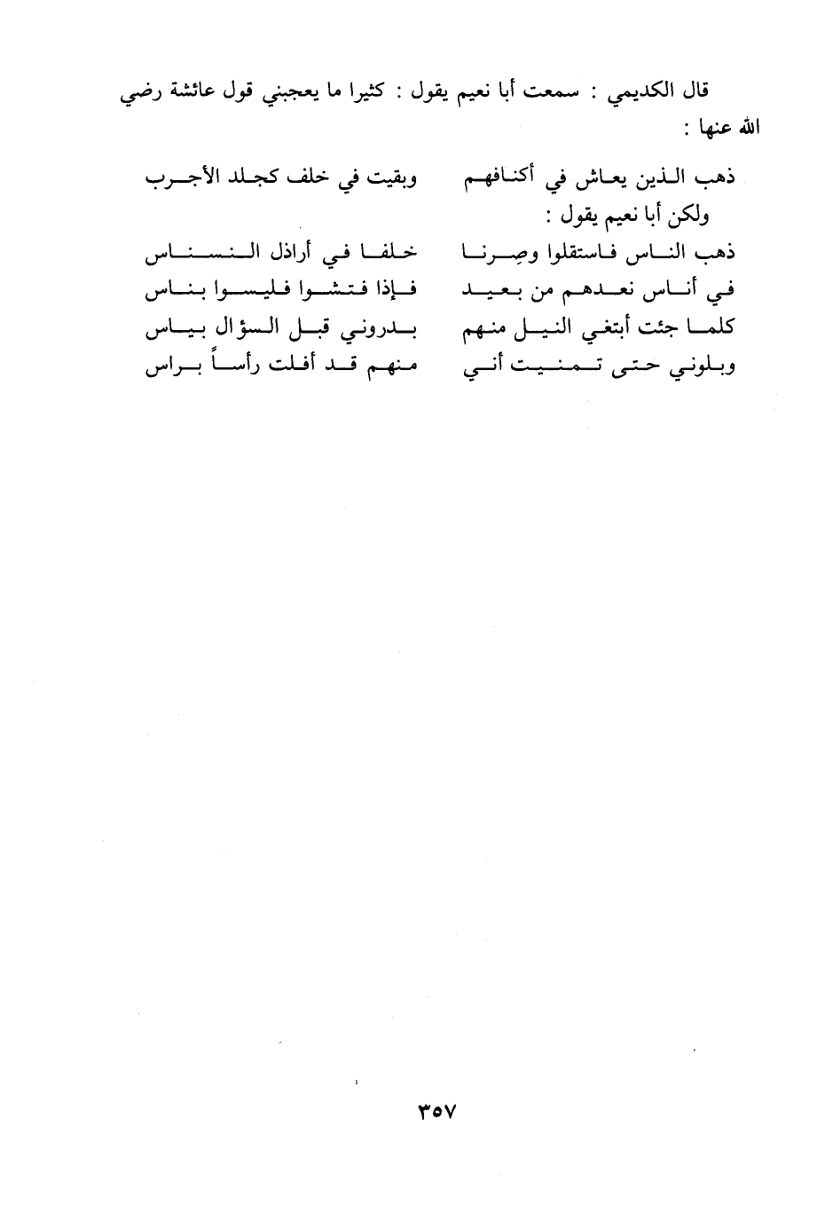 ، قال الكديمي: سمعت أبا نُعيم يقول: كثيرا ما يعجبني قول عائشة رضي اللَّه عنها: