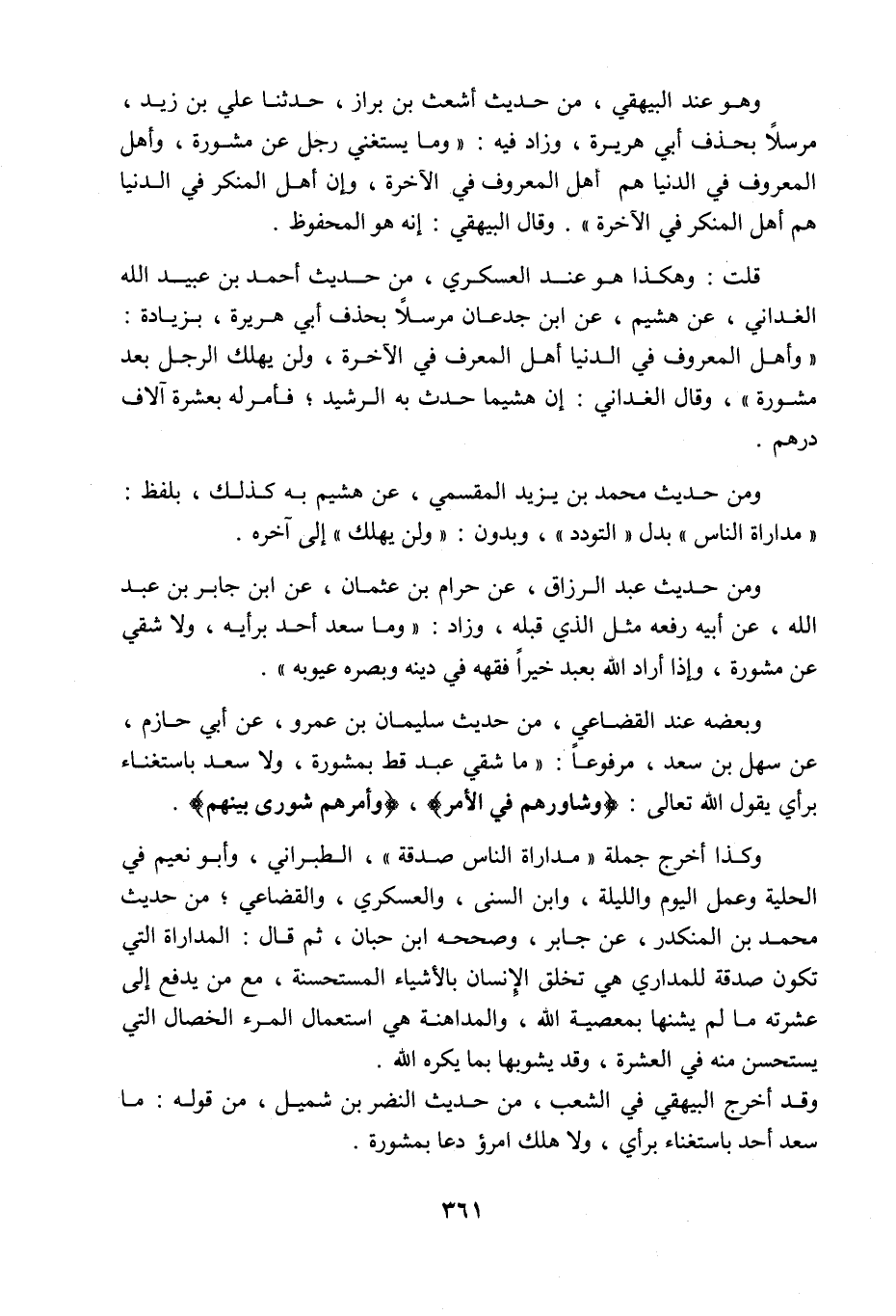 وهو عند البيهقي من حديث أشعث بن براز حدثنا علي بن زيد مرسلا، بحذف أبي هريرة، وزاد فيه: وما يستغني رجل عن مشورة، وأهل المعروف في الدنيا، هم أهل المعروف في الآخرة، وإن أهل المنكر في الدنيا هم أهل المنكر في الآخرة. وقال البيهقي: إنه هو المحفوظ، قلت: وهكذا هو عند العسكري من حديث أحمد بن عبيد اللَّه الغداني عن هشيم عن ابن جدعان مرسلا، بحذف أبي هريرة بزيادة: وأهل المعروف في الدنيا أهل المعروف في الآخرة، ولن يهلك الرجل بعد مشورة، وقال الغداني: إن هشيما حدث به الرشيد فأمر له بعشرة آلاف درهم، ومن حديث محمد بن يزيد المقسمي عن هشيم به كذلك بلفظ: مداراة الناس بدل التودد، وبدون: ولن يهلك إلى آخره. ومن حديث عبد الرزاق عن حرام بن عثمان، عن ابن جابر بن عبد اللَّه، عن أبيه رفعه: مثل الذي قبله، وزاد: وما سعد أحد برأيه، ولا شقي عن مشورة، وإذا أراد اللَّه بعبد خيرا فقهه في دينه، وبصره عيوبه، وبعضه عند القضاعي من حديث سليمان بن عمرو عن أبي حازم عن سهل بن سعد مرفوعا: ما شقي عبد قط بمشورة، ولا سعد باستغناء برأي، يقول اللَّه تعالى {وَشَاوِرْهُمْ فِي الأَمْرِ} ، {وَأَمْرُهُمْ شُورَى بَيْنَهُمْ} ، وكذا أخرج جملة مداراة الناس صدقة، الطبراني وأبو نُعيم في الحلية، وعمل اليوم والليلة، وابن السني، والعسكري، والقضاعي، من حديث محمد ابن المنكدر عن جابر، وصححه ابن حبان، ثم قال: المداراة التي تكون صدقة للمداري هي تخلق الإنسان بالأشياء المستحسنة، مع من يدفع إلى عشرته ما لم يشبها بمعصية اللَّه، والمداهنة هي استعمال المرء الخصال التي يستحسن منه في العشرة، وقد يشوبها بما يكره اللَّه، وقد أخرج البيهقي في الشعب من حديث النضر بن شميل من قوله: ما سعد أحد باستغناء برأي، ولا هلك امرؤ دعا بمشورة،