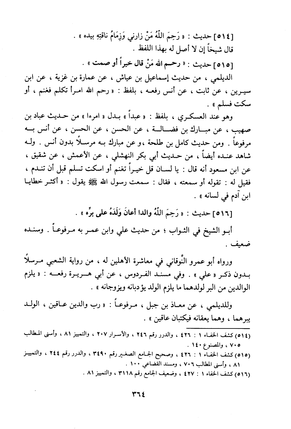 516 - حَدِيث: رَحِمَ اللَّه وَالِدًا أَعَانَ وَلَدَهُ عَلَى بِرِّهِ، أبو الشيخ في الثواب من حديث علي وابن عمر به مرفوعا، وسنده ضعيف، ورواه أبو عمرو النوقاني في معاشرة الأهلين له من رواية الشعبي مرسلا، بدون ذكر علي، وفي مسند الفردوس عن أبي هريرة رفعه: يلزم الوالدين من البر لولدهما ما يلزم الولد، يؤدبانه ويزوجانه. وللديلمي عن معاذ بن جبل مرفوعا: رب والدين عاقين، الولد يبرهما، وهما يعقانه، فيكتبان عاقين،
