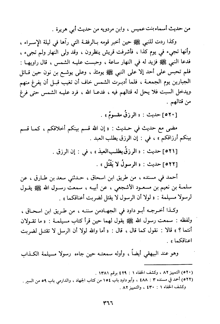 522 - حَدِيث: الرَّسُولُ لا يُقْتَلُ، أحمد في مسنده من طريق ابن إسحاق، حدثني سعد بن طارق عن سلمة بن نُعيم بن مسعود الأشجعي عن أبيه، سمعت رسول اللَّه صَلَّى اللَّهُ عَلَيْهِ وَسَلَّمَ يقول لرسول مسيلمة: لولا أن الرسول لا يقتل لضربت أعناقكما، وكذا أخرجه أبو داود في الجهاد من سننه من طريق ابن إسحاق، ولفظه: سمعت رسول اللَّه صَلَّى اللَّهُ عَلَيْهِ وَسَلَّمَ يقول لهما حين قرأ كتاب مسيلمة: ما تقولان أنتما؟ قالا: تقول كما قال، قال: أما واللَّه لولا أن الرسل لا تقتل لضربت أعناقكما، وهو عند البيهقي أيضا، وأوله: سمعته حين جاءه رسول مسيلمة الكذاب