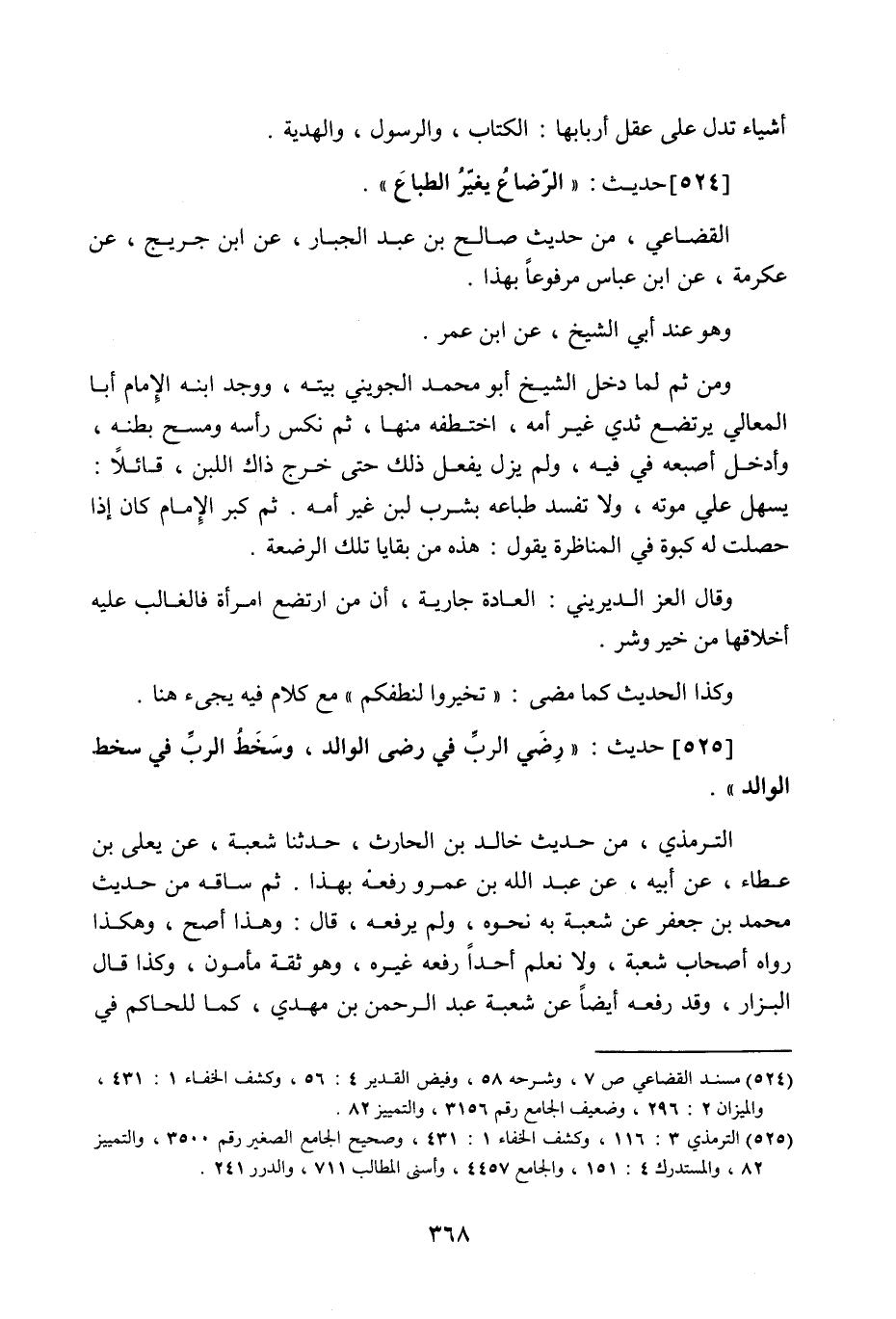 524 - حَدِيث: الرَّضَاعُ يُغَيِّرُ الطِّبَاعَ، القضاعي من حديث صالح بن عبد الجبار عن ابن جريج عن عكرمة عن ابن عباس مرفوعا بهذا، وهو عند أبي الشيخ، عن ابن عمر، ومن ثم لما دخل الشيخ أبو محمد الجويني بيته، وجد ابنه الإمام أبا المعالي يرتضع ثدي غير أمه اختطفه منها، ثم نكس رأسه، ومسح بطنه، وأدخل أصبعه في فيه، ولم يزل يفعل ذلك حتى خرج ذاك اللبن، قائلا: يسهل علي موته، ولا تفسد طباعه بشرب لبن غير أمه، ثم لما كبر الإمام كان إذا حصلت له كبوة في المناظرة يقول: هذه من بقايا تلك الرضعة، وقال العز الديريني: العادة جارية، أن من ارتضع امرأة، فالغالب عليه أخلاقها، من خير وشر، وكذا الحديث كما مضى: تخيروا لنطفكم، مع كلام فيه يجيء هنا.