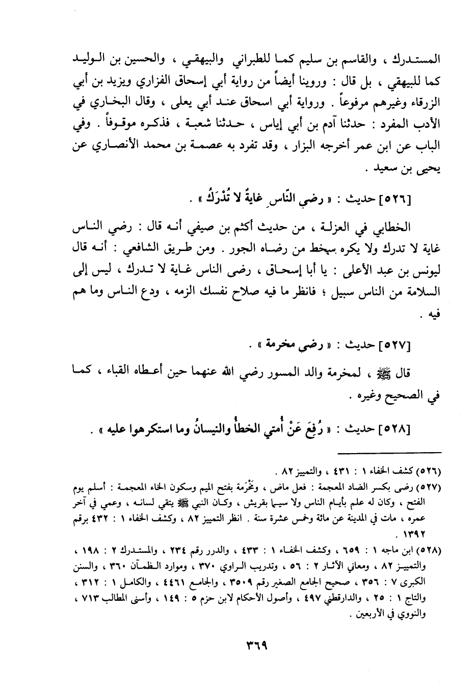 526 - حديث: رضى الناس غاية لا تدرك، الخطابي في العزلة من حديث أكثم بن صيفي أنه قال: رضى الناس غاية لا تدرك، ولا يكره سخط من رضاه الجور، ومن طريق الشافعي أنه قال ليونس بن عبد الأعلى: يا أبا إسحاق! رضى الناس غاية لا تدرك، ليس إلى السلامة من الناس سبيل، فانظر ما فيه صلاح نفسك الزمه، ودع الناس وما هم فيه.