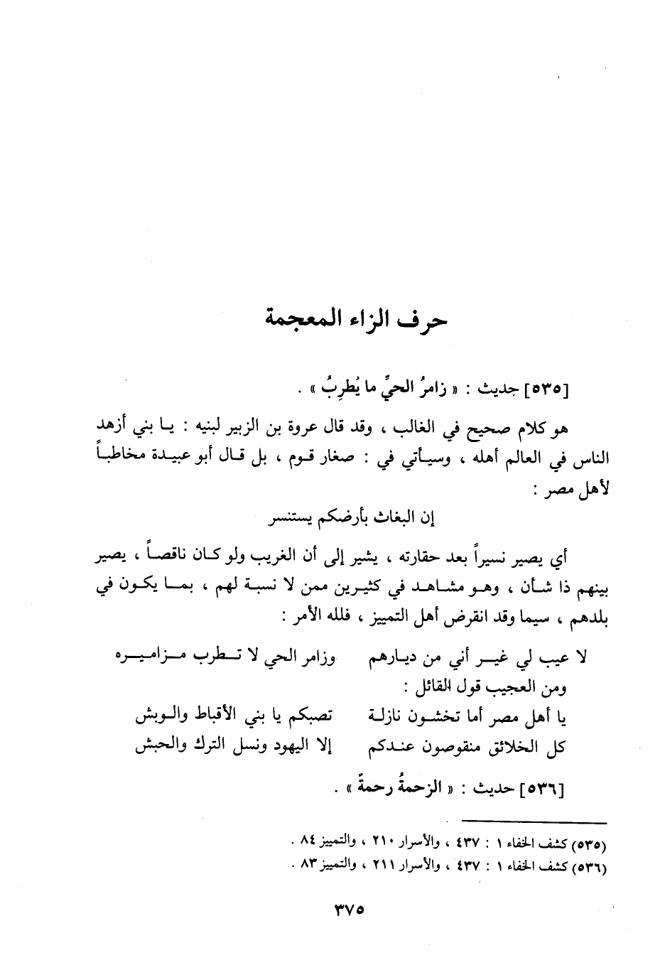 535 - حديث: زامر الحي ما يطرب، هو كلام صحيح في الغالب، وقد قال عروة بن الزبير لبنيه: يا بني أزهد الناس في العالم أهله، وسيأتي في: صغار قوم، بل قال أبو عبيدة مخاطبا لأهل مصر: