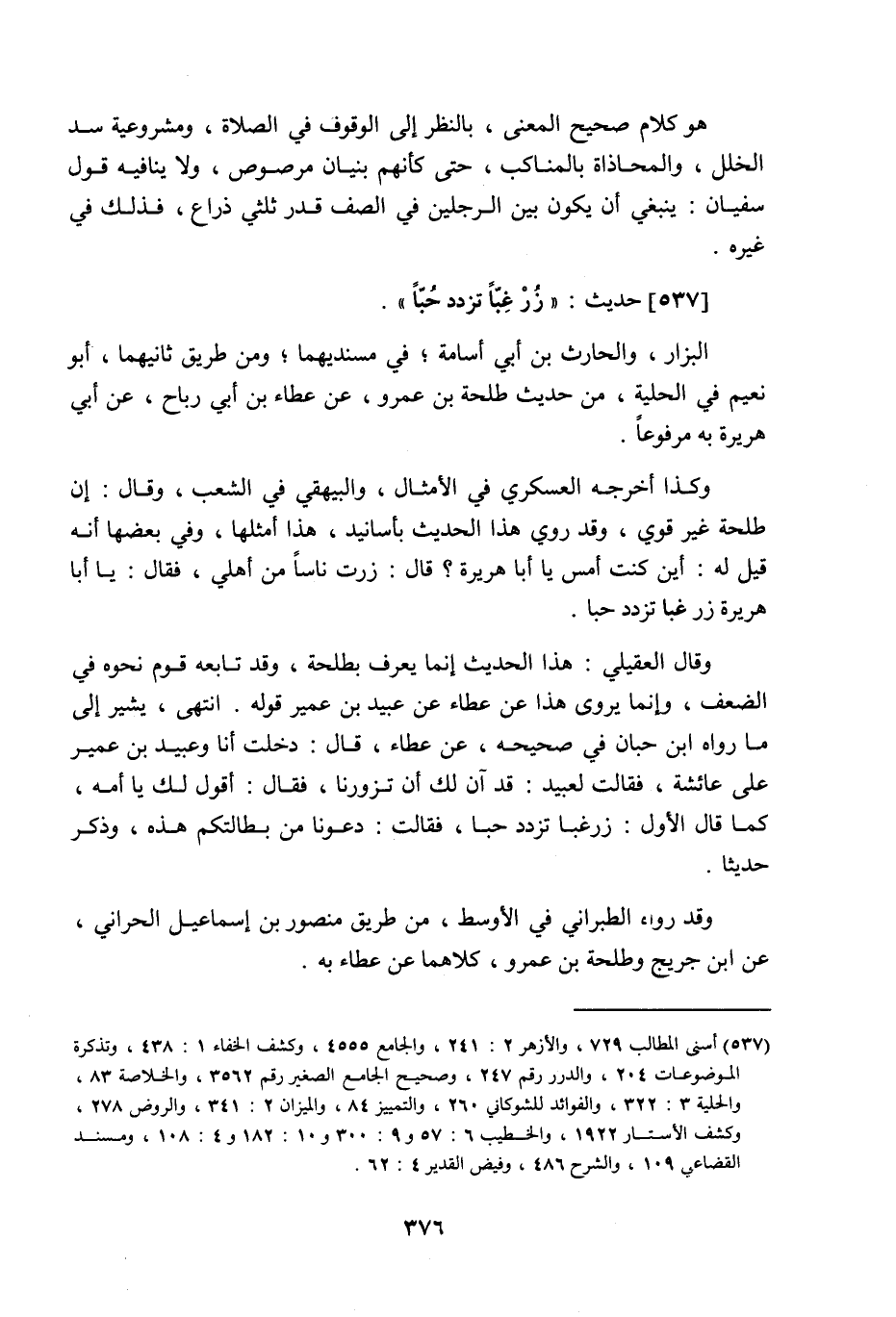 537 - حَدِيث: زُرْ غِبًّا تَزْدَدْ حُبًّا، البزار والحارث بن أبي أسامة في مسنديهما، ومن طريق ثانيهما، أبو نُعيم في الحلية، من حديث طلحة بن عمرو عن عطاء بن أبي رباح عن أبي هريرة به مرفوعا، وكذا أخرجه العسكري في الأمثال، والبيهقي في الشعب، وقال: إن طلحة غير قوي، وقد روي هذا الحديث بأسانيد هذا أمثلها، وفي بعضها أنه قيل له: أين كنت أمس يا أبا هريرة، قال: زرت ناسا من أهلي، فقال: يا أبا هريرة زر غبا تزدد حبا، وقال العقيلي: هذا الحديث إنما يعرف بطلحة، وقد تابعه قوم نحوه في الضعف، وإنما يروى هذا عن عطاء عن عبيد بن عمير قوله انتهى، يشير إلى ما رواه ابن حبان في صحيحه، عن عطاء قال: دخلت أنا وعبيد بن عمير على عائشة، فقال لعبيد: قد آن لك أن تزورنا، فقال: أقول لك يا أمه، كما قال الأول: زر غبا تزدد حبا، فقال: دعونا من بطالتكم هذه، وذكر حديثا، وقد رواه الطبراني في الأوسط، من طريق منصور بن إسماعيل الحراني عن ابن جريج وطلحة بن عمرو، كلاهما عن عطاء به،