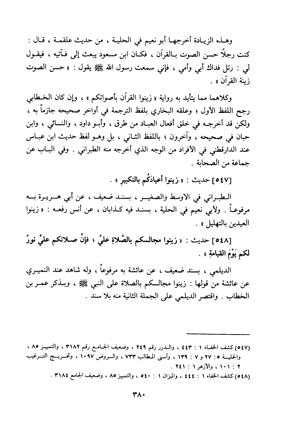 547 - حَدِيث: زَيِّنُوا أَعْيَادَكُمْ بِالتَّكْبِيرِ، الطبراني في الأوسط والصغير، بسند ضعيف، عن أبي هريرة به مرفوعا، ولأبي نُعيم في الحلية بسند فيه كذابان، عن أنس، رفعه: زينوا العيدين بالتهليل.