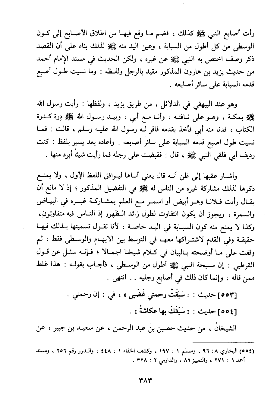 رأت أصابع النبي صَلَّى اللَّهُ عَلَيْهِ وَسَلَّمَ كذلك، فضم ما وقع فيها من إطلاق الأصابع إلى كون الوسطى من كل أطول من السبابة، وعين اليد منه صَلَّى اللَّهُ عَلَيْهِ وَسَلَّمَ، لذلك بناء على أن القصد ذكر وصف اختص به النبي صَلَّى اللَّهُ عَلَيْهِ وَسَلَّمَ عن غيره، ولكن الحديث في مسند الإمام أحمد من حديث يزيد بن هارون المذكور مقيد بالرجل، ولفظه: وما نسيت طول أصبع قدمه السبابة على سائر أصابعه، وهو عند البيهقي في الدلائل من طريق يزيد، ولفظها: رأيت رسول اللَّه صَلَّى اللَّهُ عَلَيْهِ وَسَلَّمَ بمكة، وهو على ناقته، وأنا مع أبي، وبيد رسول اللَّه صَلَّى اللَّهُ عَلَيْهِ وَسَلَّمَ درة كدرة الكتاب، فدنا منه أبي، فأخذ بقدمه، فأقر له رسول اللَّه صَلَّى اللَّهُ عَلَيْهِ وَسَلَّمَ، قالت: فما نسيت طول أصبع قدمه السبابة على سائر أصابعه، وأعاده بعد يسير بلفظ: كنت رديف أبي، فلقي النبي صَلَّى اللَّهُ عَلَيْهِ وَسَلَّمَ قال: فقبضت على رجله، فما رأيت شيئا أبرد منها، وأشار عقبها إلى ظن أنه قال يعني إياها ليوافق اللفظ الأول، ولا يمنع ذكرها لذلك مشاركة غيره من الناس له صَلَّى اللَّهُ عَلَيْهِ وَسَلَّمَ، في التفضيل المذكور، إذ لا مانع أن يقال رأيت فلانا وهو أبيض أو أسمر مع العلم بمشاركة غيره في البياض والسمرة، ويجوز أن يكون التفاوت لطول زائد الظهور، إذ الناس فيه متفاوتون، وكذا لا يمنع منه كون السبابة في اليد خاصة، لأنا نقول تسميتها بذلك فيها حقيقة وفي القدم لاشتراكها معها في التوسط بين الإبهام والوسطى فقط، ثم وقفت على ما أوضحته بالبيان في كلام شيخنا إجمالا، فإنه سئل عن قول القرطبي: إن مسبحة النبي صَلَّى اللَّهُ عَلَيْهِ وَسَلَّمَ أطول من الوسطى، فأجاب بقوله: هذا غلط ممن قاله، وإنما كان ذلك في أصابع رجليه انتهى.