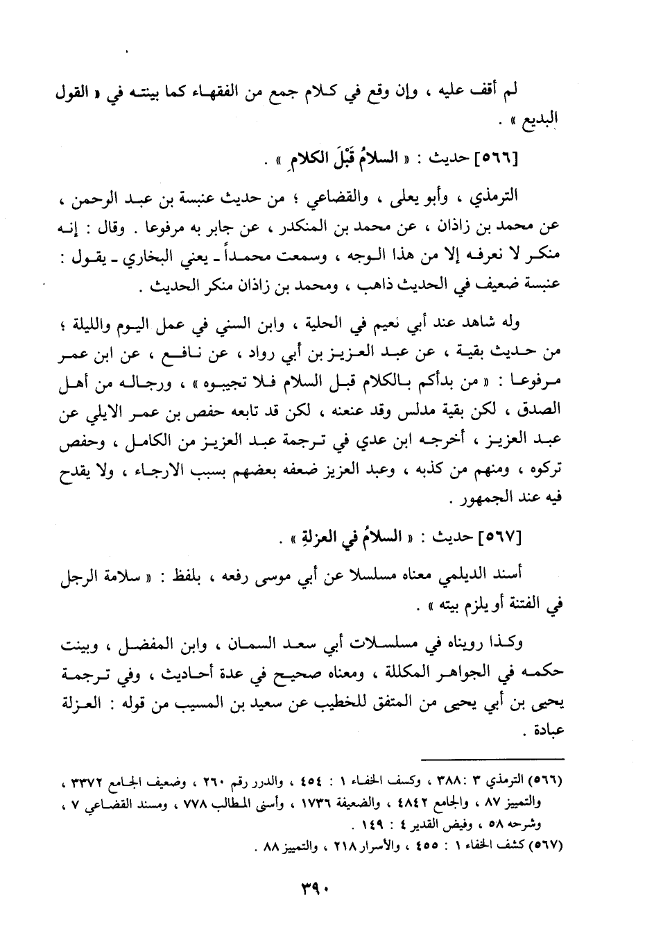 566 - حَدِيث: السَّلامُ قَبْلَ الْكَلامِ، الترمذي وأبو يعلى والقضاعي من حديث عنبسة بن عبد الرحمن عن محمد بن زاذان عن محمد بن المنكدر عن جابر به مرفوعا، وقال: إنه منكر لا نعرفه إلا من هذا الوجه، وسمعت محمدا، يعني البخاري، يقول: عنبسة ضعيف في الحديث ذاهب، ومحمد بن زاذان منكر الحديث، وله شاهد عند أبي نُعيم في الحلية، وابن السني في عمل اليوم والليلة، من حديث بقية عن عبد العزيز بن أبي رواد عن نافع عن ابن عمر مرفوعا: من بدأكم بالكلام قبل السلام فلا تجيبوه، ورجاله من أهل الصدق، لكن بقية مدلس وقد عنعنه، لكن قد تابعه حفص بن عمر الأيلي عن عبد العزيز، أخرجه ابن عدي في ترجمة عبد العزيز من الكامل، وحفص تركوه، ومنهم من كذبه، وعبد العزيز ضعفه بعضهم بسبب الإرجاء، ولا يقدح فيه عند الجمهور.