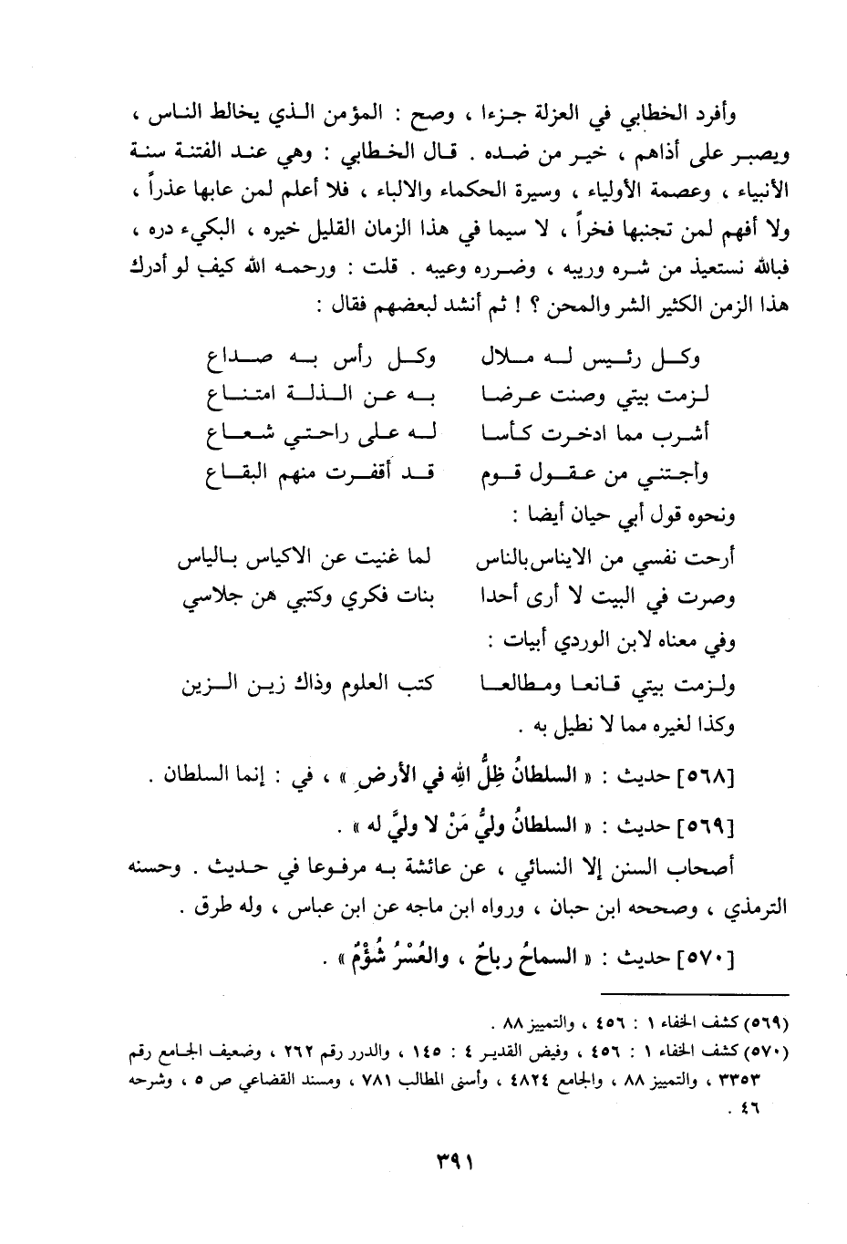 وأفرد الخطابي في العزلة جزءا، وصح: المؤمن الذي يخالط الناس، ويصبر على أذاهم، خير من ضده، قال الخطابي: وهي عند الفتنة سنة الأنبياء، وعصمة الأولياء، وسيرة الحكماء والألباء، فلا أعلم لمن عابها عذرا، ولا أفهم لمن تجنبها فخرا، لا سيما في هذا الزمان القليل خيره، البكيء دره، فباللَّه نستعيذ من شره وريبه، وضرره وعيبه، قلت: ورحمه اللَّه كيف لو أدرك هذا الزمن الكثير الشر والمحن، ثم أنشد لبعضهم فقال: