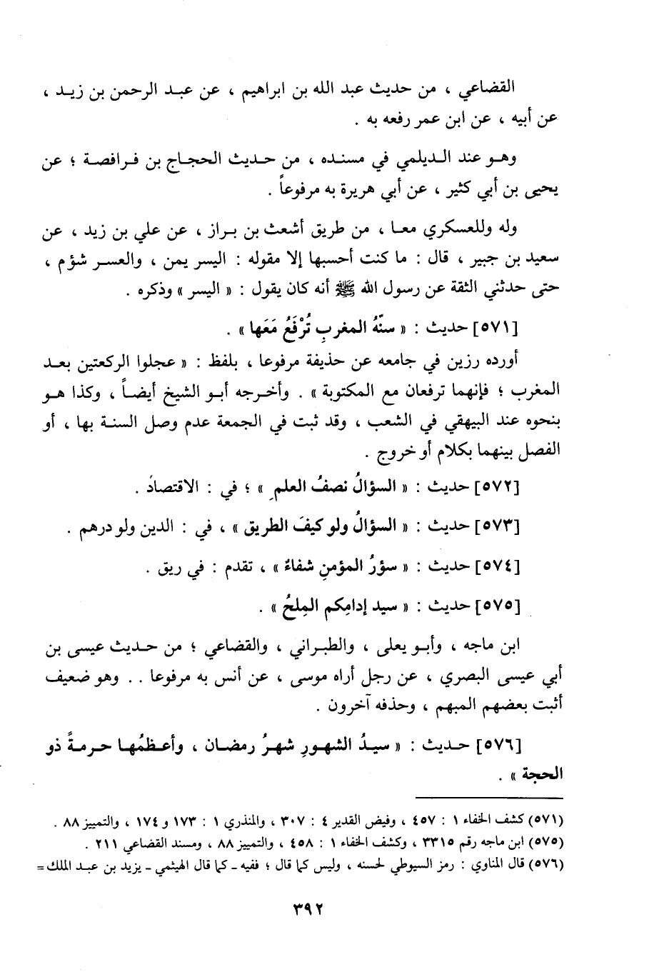 571 - حَدِيث: سُنَّةُ الْمَغْرِبِ تُرْفَعُ مَعَهَا، أورده رزين في جامعه عن حذيفة به مرفوعا، بلفظ: عجلوا الركعتين بعد المغرب، فإنهما ترفعان مع المكتوبة، وأخرجه أبو الشيخ أيضا، وكذا هو بنحوه عند البيهقي في الشعب، وقد ثبت في الجمعة عدم وصل السنة بها، أو الفصل بينهما بكلام، أو خروج.