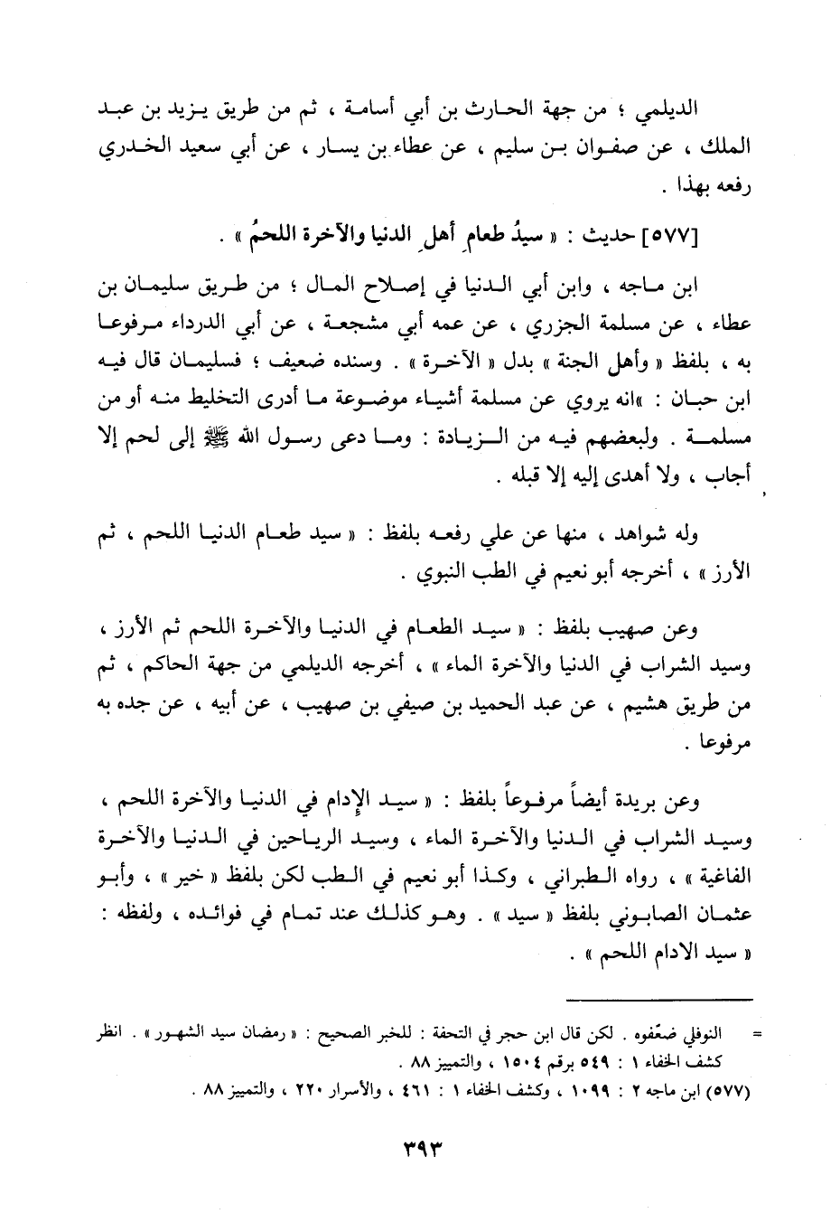 577 - حَدِيث: سَيِّدُ طَعَامِ أَهْلِ الدُّنْيَا وَالآخِرَةِ اللَّحْمُ، ابن ماجه وابن أبي الدنيا في إصلاح المال من طريق سليمان بن عطاء عن مسلمة الجزري عن عمه أبي مشجعة، عن أبي الدرداء مرفوعا به، بلفظ: وأهل الجنة، بدل الآخرة، وسنده ضعيف، فسليمان قال فيه ابن حبان: إنه يروي عن مسلمة أشياء موضوعة، ما أدري التخليط منه، أو من مسلمة، ولبعضهم فيه من الزيادة: وما دعي رسول اللَّه صَلَّى اللَّهُ عَلَيْهِ وَسَلَّمَ إلى لحم إلا أجاب، ولا أهدي إليه إلا قبله، وله شواهد، منها عن علي رفعه بلفظ: سيد طعام الدنيا اللحم، ثم الأرز، أخرجه أبو نُعيم في الطب النبوي، وعن صهيب بلفظ: سيد الطعام في الدنيا والآخرة اللحم، ثم الأرز، وسيد الشراب في الدنيا والآخرة الماء، أخرجه الديلمي من جهة الحكم، ثم من طريق هشيم عن عبد الحميد بن صيفي بن صهيب، عن أبيه عن جده به مرفوعا، وعن بريدة أيضا مرفوعا بلفظ: سيد الإدام في الدنيا والآخرة اللحم، وسيد الشراب في الدنيا والآخرة الماء، وسيد الرياحين في الدنيا والآخرة الفاغية. رواه الطبراني، وكذا أبو نُعيم في الطب، لكن بلفظ: خير، وأبو عثمان الصابوني، بلفظ: سيد، وهو كذلك عند تمام في فوائده، ولفظه: سيد الإدام اللحم،