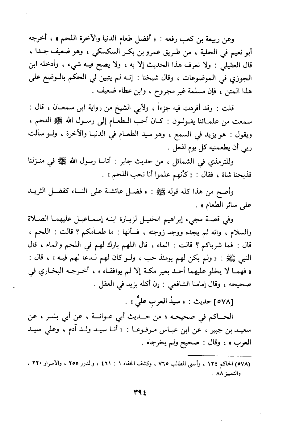 وعن ربيعة بن كعب رفعه: أفضل طعام الدنيا والآخرة اللحم، أخرجه أبو نُعيم في الحلية من طريق عمرو بن بكر السكسكي، وهو ضعيف جدا، قال العقيلي: ولا نعرف هذا الحديث إلا به، ولا يصح فيه شيء، وأدخله ابن الجوزي في الموضوعات، وقال شيخنا: إنه لم يتبين لي الحكم بالوضع على هذا المتن، فإن مسلمة غير مجروح، وابن عطاء ضعيف، قلت: وقد فردت فيه جزءا، ولأبي الشيخ من رواية ابن سمعان، قال: سمعت من علمائنا يقولون: كان أحب الطعام إلى رسول اللَّه صَلَّى اللَّهُ عَلَيْهِ وَسَلَّمَ اللحم، ويقول: هو يزيد في السمع، وهو سيد الطعام في الدنيا والآخرة، ولو سألت ربي أن يطعمنيه كل يوم لفعل، وللترمذي في الشمائل من حديث جابر: أتانا رسول اللَّه صَلَّى اللَّهُ عَلَيْهِ وَسَلَّمَ في منزلنا، فذبحنا شاة، فقال: كأنهم علموا أنا نحب اللحم، وأصح من هذا كله قوله صَلَّى اللَّهُ عَلَيْهِ وَسَلَّمَ: فضل عائشة على النساء كفضل الثريد على سائر الطعام، وفي قصة مجيء إبراهيم الخليل لزيارة ابنه إسماعيل عليهما الصلاة والسلام: وإنه لم يجده ووجد زوجته، فسألها: ما طعامكم؟ قالت: اللحم، قال: فما شرابكم؟ قالت: الماء، قال: اللَّهم بارك لهم في اللحم والماء، قال النبي صَلَّى اللَّهُ عَلَيْهِ وَسَلَّمَ: ولم يكن لهم يومئذ حب، ولو كان لهم لدعا لهم فيه، قال: فهما لا يخلو عليهما أحد بعير مكة إلا لم يوافقاه، أخرجه البخاري في صحيحه، وقال إمامنا الشافعي: إن أكله يزيد في العقل.