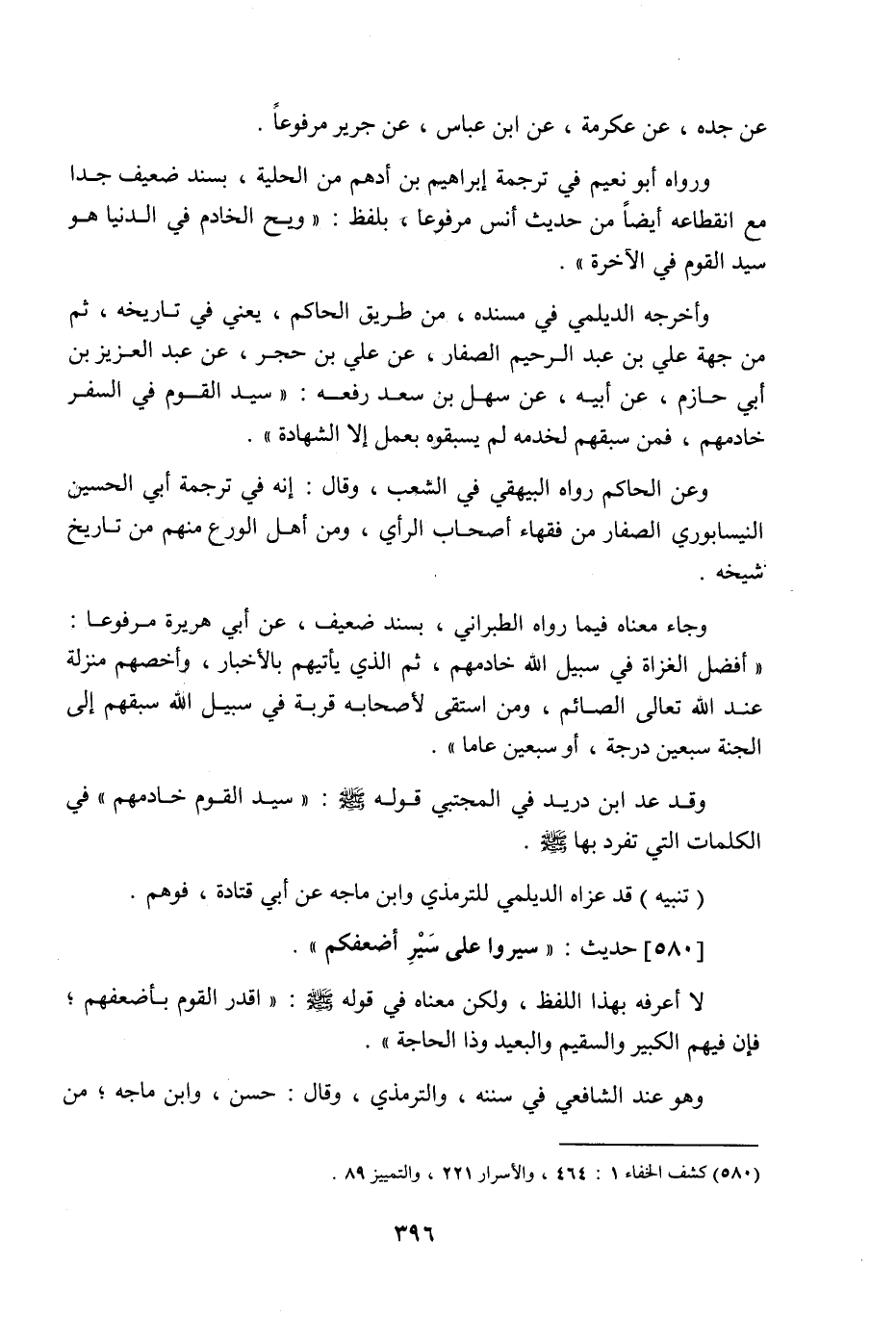 580 - حَدِيث: سِيرُوا عَلَى سَيْرِ أَضْعَفِكُمْ، لا أعرفه بهذا اللفظ، ولكن معناه في قوله صَلَّى اللَّهُ عَلَيْهِ وَسَلَّمَ: أقدر القوم بأضعفهم، فإن فيهم الكبير والسقيم والبعيد وذا الحاجة، وهو عند الشافعي في سننه، والترمذي، وقال: حسن، وابن ماجه من