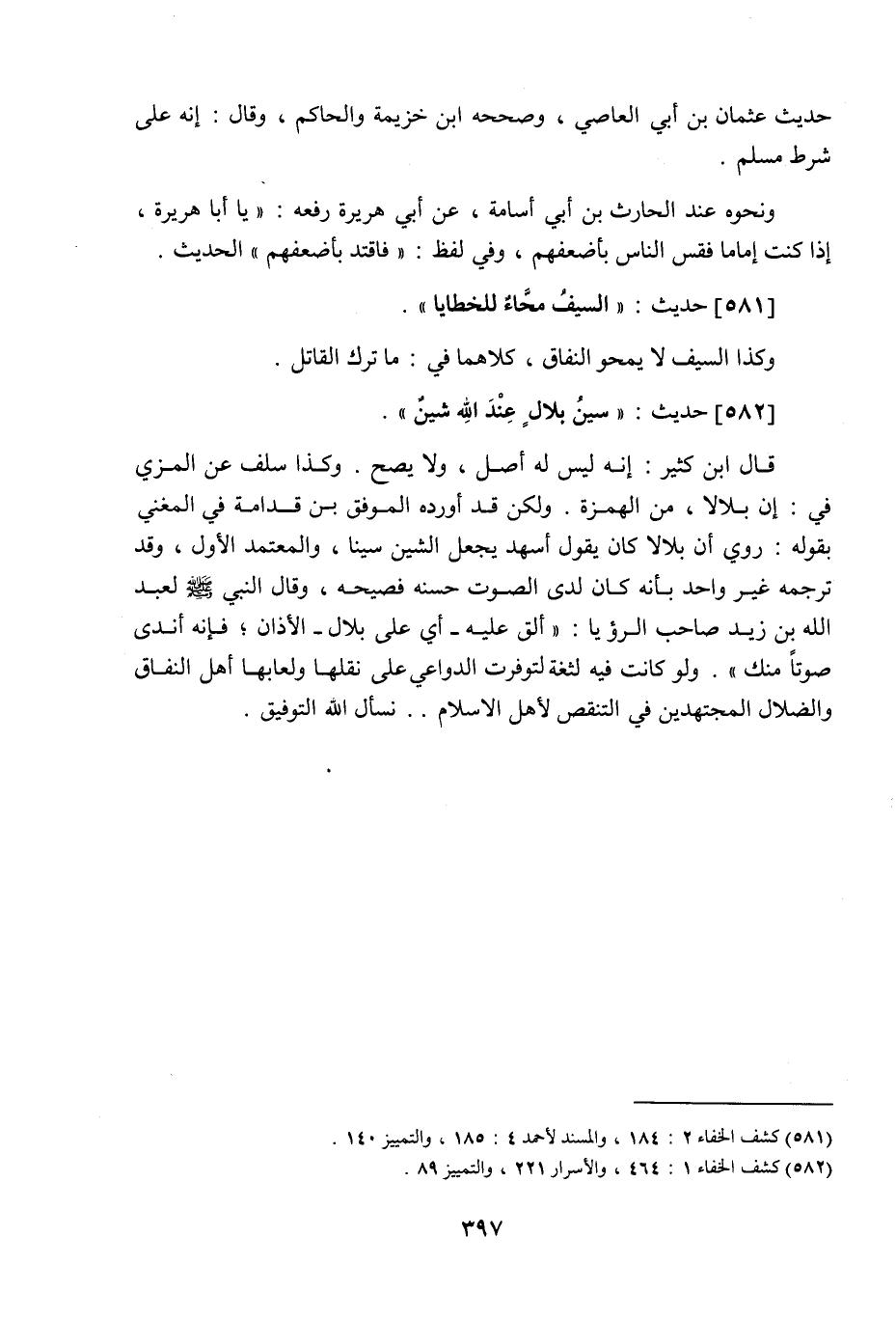 582 - حَدِيث: سِينُ بِلالٍ عِنْدَ اللَّه شِينٌ، قال ابن كثير: إنه ليس له أصل، ولا يصح، وكذا سلف عن المزي في: إن بلالا، من الهمزة، ولكن قد أورده الموفق ابن قدامة في المغني بقوله: روي أن بلالا كان يقول أسهد، يجعل الشين سينا، والمعتمد الأول، وقد ترجمه غير واحد بأنه كان ندي الصوت حسنه فصيحه، وقال النبي صَلَّى اللَّهُ عَلَيْهِ وَسَلَّمَ لعبد اللَّه بن زيد صاحب الرؤيا: ألق عليه، أي على بلال، الأذان، فإنه أندى صوتا منك، ولو كانت فيه لثغة لتوفرت الدواعي على نقلها، ولعابها أهل النفاق والضلال، المجتهدين في التنقص لأهل الإسلام، نسأل اللَّه التوفيق