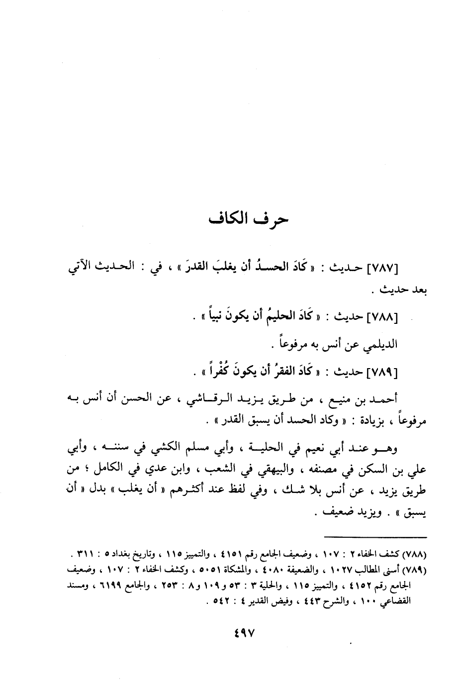 789 - حَدِيث: كَادَ الْفَقْرُ أَنْ يَكُونَ كُفْرًا، أحمد بن منيع من طريق يزيد الرقاشي عن الحسن أن أنس به مرفوعا، بزيادة: وكاد الحسد أن يسبق القدر، وهو عند أبي نُعيم في الحلية، وأبي مسلم الكشي في سننه، وأبي علي بن السكن في مصنفه، والبيهقي في الشعب، وابن عدي في الكامل، من طريق يزيد عن أنس بلا شك، وفي لفظ عند أكثرهم: أن يغلب، بدل: أن يسبق، ويزيد ضعيف،