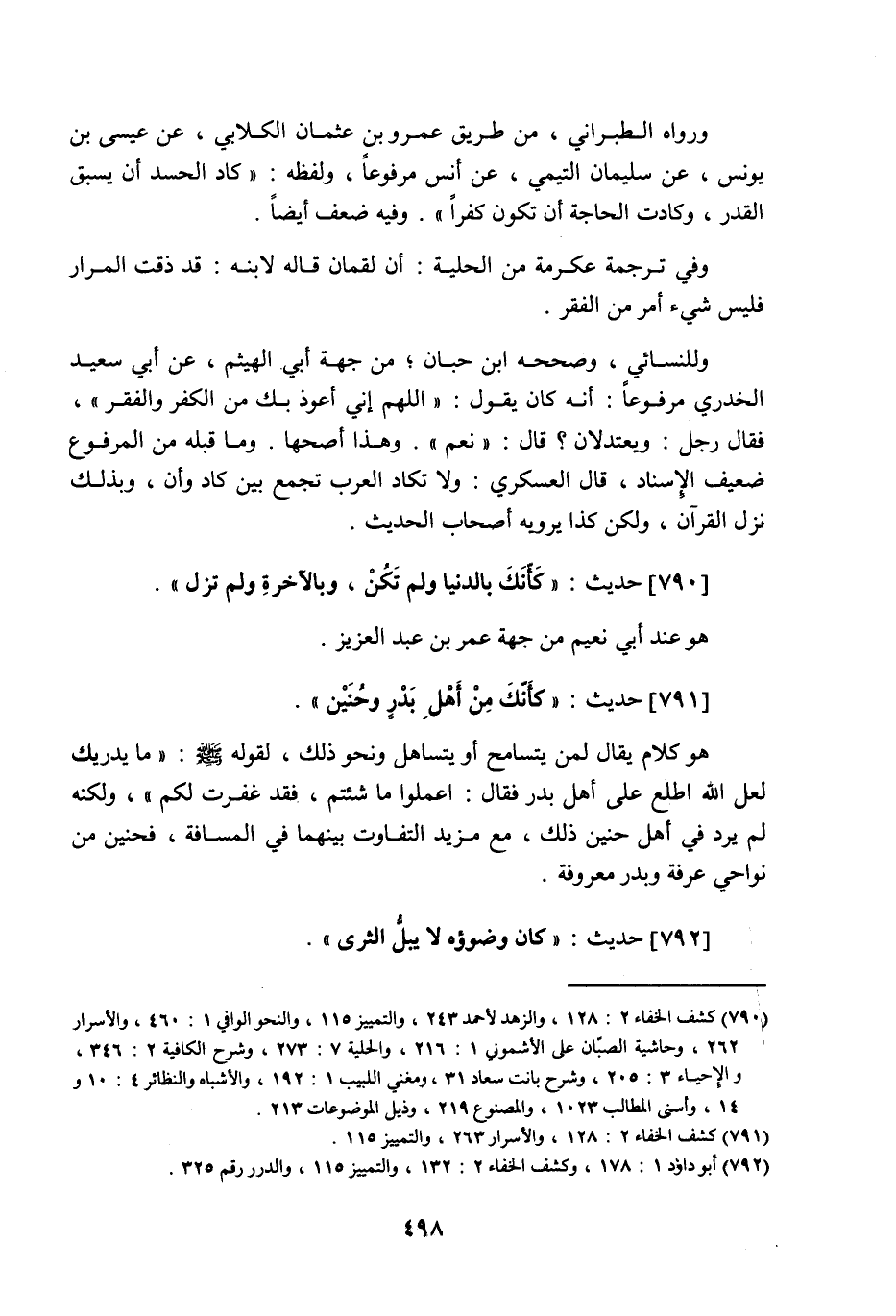 791 - حَدِيث: كَأَنَّكَ مِنْ أَهْلِ بَدْرٍ وَحُنَيْنٍ، هو كلام يقال لمن بتسامح أو يتساهل ونحو ذلك، لقوله صَلَّى اللَّهُ عَلَيْهِ وَسَلَّمَ: ما يدريك لعل اللَّه اطلع على أهل بدر، فقال: اعملوا ما شئتم، فقد غفرت لكم، ولكنه لم يرد في أهل حنين ذلك، مع مزيد التفاوت بينهما في المسافة، فحنين من نواحي عرفة، وبدر معروفة.
