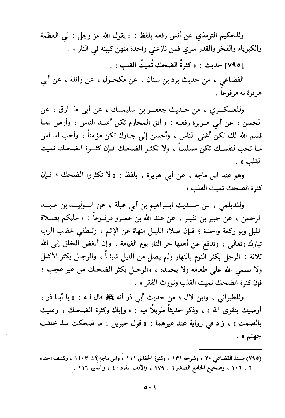 795 - حَدِيث: كَثْرَةُ الضَّحِكِ تُمِيتُ الْقَلْبَ، القضاعي من حديث برد بن سنان عن مكحول عن واثلة عن أبي هريرة به مرفوعا، وللعسكري من حديث جعفر بن سليمان عن أبي طارق عن الحسن عن أبي هريرة رفعه: اتق المحارم تكن أعبد الناس، وارض بما قسم اللَّه لك تكن أغنى الناس، وأحسن إلى جارك تكن مؤمنا، وأحب للناس ما تحب لنفسك تكن مسلما، ولا تكثر الضحك فإن كثرة الضحك تميت القلب، وهو عند ابن ماجه عن أبي هريرة بلفظ: لا تكثروا الضحك فإن كثرة الضحك تميت القلب، وللديلمي من حديث إبراهيم بن أبي عيلة عن الوليد بن عبد الرحمن عن جبير بن نفير عن عبد اللَّه بن عمرو مرفوعا: عليكم بصلاة الليل ولو ركعة واحدة، فإن صلاة الليل منهاة عن الإثم، وتطفئ غضب الرب تبارك وتعالى، وتدفع عن أهلها حر النار يوم القيامة، وإن أبغض الخلق إلى اللَّه ثلاثة: الرجل يكثر النوم بالنهار ولم يصل من الليل شيئا، والرجل يكثر الأكل ولا يسمي اللَّه على طعامه ولا يحمده، والرجل يكثر الضحك من غير عجب، فإن كثرة الضحك تميت القلب وتورث الفقر، وللطبراني وابن لال من حديث أبي ذر أنه صَلَّى اللَّهُ عَلَيْهِ وَسَلَّمَ قال له: يا أبا ذر أوصيك نتقوى اللَّه، وذكر حديثا طويلا فيه: وإياك وكثرة الضحك وعليك بالصمت، زاد في رواية عند غيرهما: قول جبريل: ما ضحكت منذ خلقت جهنم،