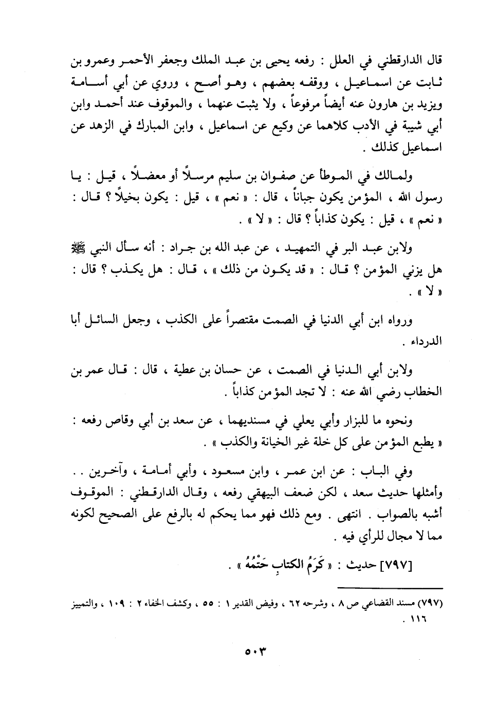 قال الدارقطني في العلل: رفعه يحيى بن عبد الملك وجعفر الأحمر وعمرو بن ثابت عن إسماعيل، ووقفه بعضهم وهو أصح، وروي عن أبي أسامة ويزيد بن هارون عنه أيضا مرفوعا، ولا يثبت عنهما والموقوف عند أحمد وابن أبي شيبة في الأدب كلاهما عن وكيع عن إسماعيل، وابن المبارك في الزهد عن إسماعيل كذلك، ولمالك في الموطأ عن صفوان بن سليم مرسلا أو معضلا قيل: يا رسول اللَّه المؤمن يكون جبانا قال: نعم، قيل: يكون بخيلا قال: نعم، قيل: يكون كذابا قال: لا، ولابن عبد البر في التمهيد عن عبد اللَّه بن جراد أنه سأل النبي صَلَّى اللَّهُ عَلَيْهِ وَسَلَّمَ هل يزني المؤمن؟ قال: قد يكون من ذلك، قال: هل يكذب؟ قال: لا، ورواه ابن أبي الدنيا في الصمت مقتصرا على الكذب، وجعل السائل أبا الدرداء، ولابن أبي الدنيا في الصمت عن حسان بن عطية قال قال عمر بن الخطاب رضي اللَّه عنه: لا تجد المؤمن كذابا، ونحوه ما للبزار وأبي يعلى في مسنديهما عن سعد بن أبي وقاص رفعه: يطبع المؤمن على كل خلة غير الخيانة والكذب، وفي الباب عن ابن عمر وابن مسعود وأبي أمامة وآخرين، وأمثلها حديث سعد لكن ضعف البيهقي رفعه، وقال الدارقطني: الموقوف أشبه بالصواب، انتهى. ومع ذلك فهو مما يحكم له بالرفع على الصحيح لكونه مما لا مجال للرأي فيه.