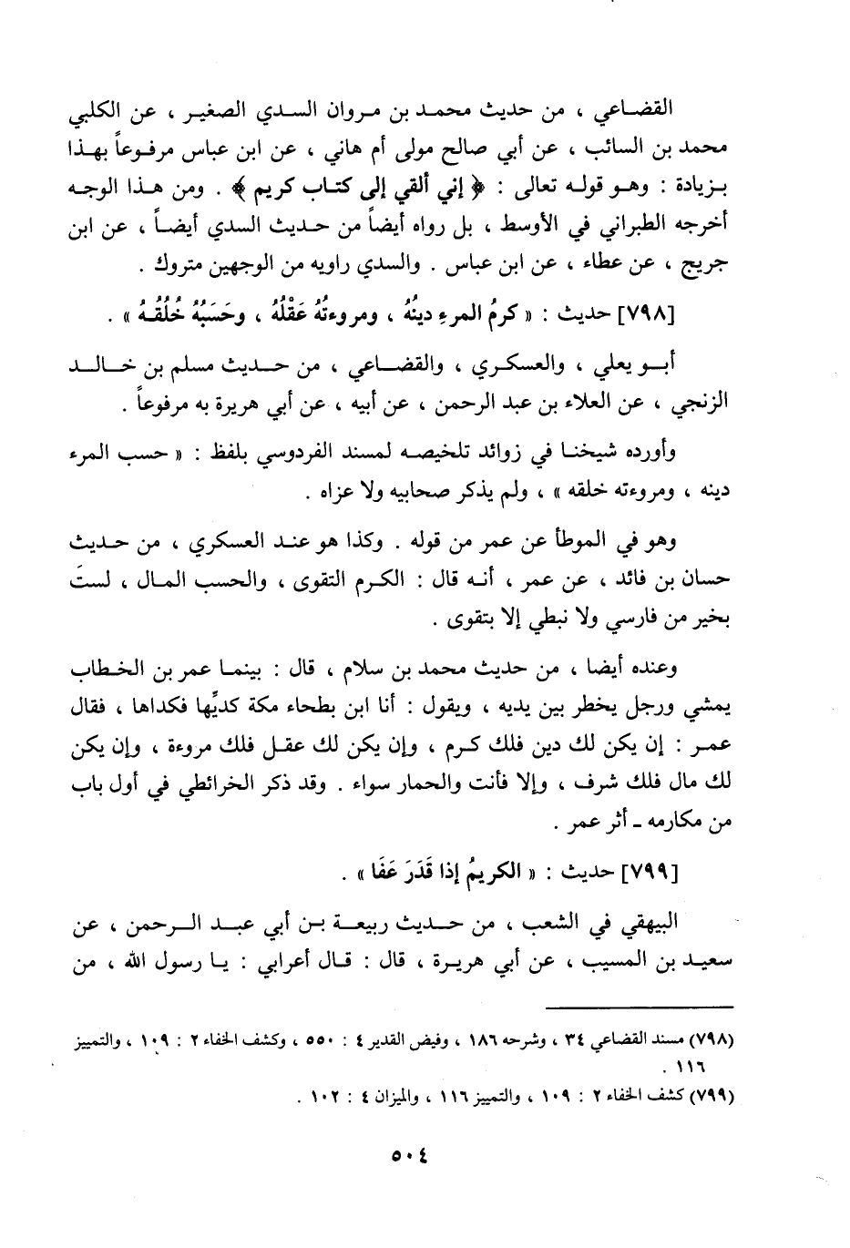798 - حَدِيث: كَرَمُ الْمَرْءِ دِينُهُ، وَمَرُوءَتُهُ عَقْلُهُ، وَحَسَبُهُ خُلُقُهُ، أبو يعلى والعسكري والقضاعي من حديث مسلم بن خالد الزنجي عن العلاء بن عبد الرحمن عن أبيه عن أبي هريرة به مرفوعا، وأورده شيخنا في زوائد تلخيصه لمسند الفردوس بلفظ: حسب المرء دينه، ومروءته خلقه، ولم يذكر صحابيه ولا عزاه، وهو في الموطأ عن عمر من قوله، وكذا هو عند العسكري من حديث حسان بن فائد عن عمر أنه قال: الكرم التقوى، والحسب المال، لست بخير من فارسي ولا نبطي إلا بتقوى، وعنده أيضا من حديث محمد بن سلام قال: بينما عمر بن الخطاب يمشي ورجل يخطر بين يديه ويقول: أنا ابن بطحاء مكة كديِّها فكداها، فقال عمر: إن لم يكن لك دين فلك كرم، وإن لم يكن لك عقل فلك مروءة، وإن لم يكن لك مال فلك شرف، وإلا فأنت والحمار سواء، وقد ذكر الخرائطي في أول باب من مكارمه. أثر عمر.