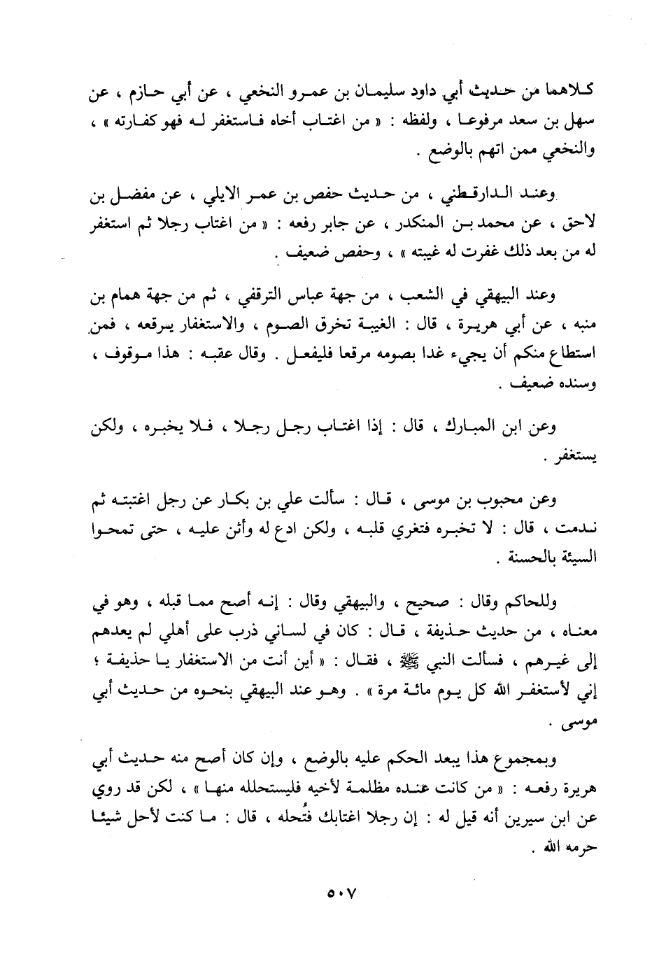 كلاهما من حديث أبي داود سليمان بن عمرو النخعي عن أبي حازم عن سهل بن سعد مرفوعا ولفظه: من اغتاب أخاه فاستغفر له فهو كفارته، والنخعي ممن اتهم بالوضع، وعند الدارقطني من حديث حفص بن عمر الأيلي عن مفضل بن لاحق عن محمد بن المنكدر عن جابر رفعه: من اغتاب رجلا ثم استغفر له من بعد ذلك غفرت له غيبته، وحفص ضعيف. وعند البيهقي في الشعب من جهة عباس الترقفي ثم من جهة همام بن منبه عن أبي هريرة قال: الغيبة تخرق الصوم والاستغفار يرفعه فمن استطاع منكم أن يجيء غدا بصومه مرقعا فليفعل، وقال عقبه: هذا موقوف وسنده ضعيف. وعن ابن المبارك قال: إذا اغتاب رجل رجلا فلا يخبره ولكن يستغفر وعن محبوب بن موسى قال: سألت علي بن بكار عن رجل اغتبته ثم ندمت، قال: لا تخبره فتغري قلبه، ولكن ادع له وأثن عليه حتى تمحوا السيئة بالحسنة، وللحاكم وقال: صحيح والبيهقي وقال: إنه أصح مما قبله، وهو في معناه من حديث حذيفة قال: كان في لساني ذرب على أهلي لم يعدهم إلى غيرهم فسألت النبي صَلَّى اللَّهُ عَلَيْهِ وَسَلَّمَ فقال: أين أنت من الاستغفار يا حذيفة إني لأستغفر اللَّه كل يوم مائة مرة، وهو عند البيهقي بنحوه من حديث أبي موسى، وبمجموع هذا يبعد الحكم عليه بالوضع، وإن كان أصح منه حديث أبي هريرة رفعه: من كان عنده مظلمة لأخيه فليستحلله منها، لكن قد روي عن ابن سيرين أنه قيل له: إن رجلا اغتابك فتُحله، قال: ما كنت لأحل شيئا حرمه اللَّه.