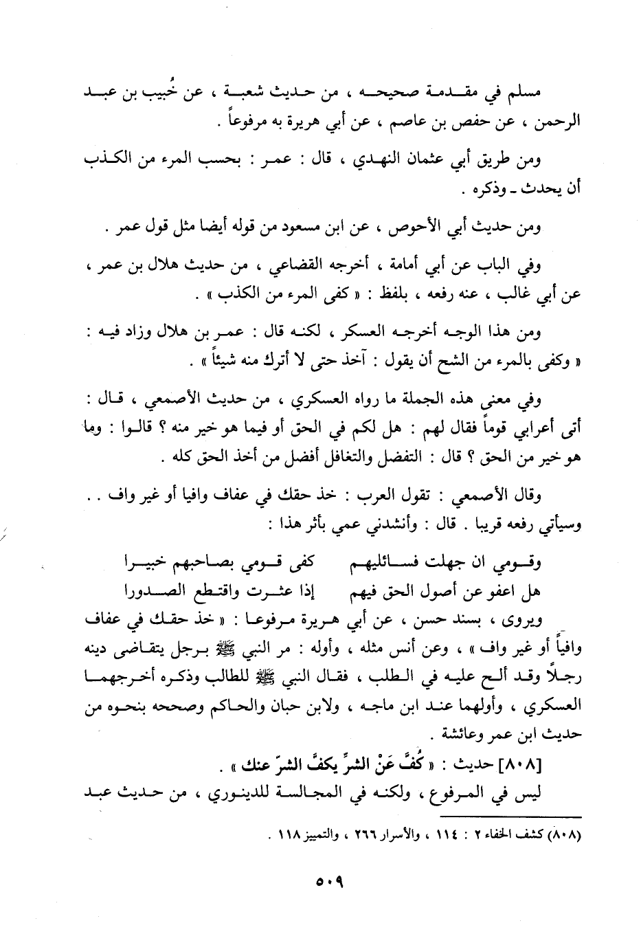 مسلم في مقدمة صحيحه من حديث شعبة عن خُبيب بن عبد الرحمن عن حفص بن عاصم عن أبي هريرة به مرفوعا، ومن طريق أبي عثمان النهدي قال: قال عمر: بحسب المرء من الكذب أن يحدث، وذكره. ومن حديث أبي الأحوص عن ابن مسعود من قوله أيضا مثل قول عمر، وفي الباب عن أبي أمامة أخرجه القضاعي من حديث هلال بن عمر عن أبي غالب عنه رفعه بلفظ: كفى المرء من الكذب، ومن هذا الوجه أخرجه العسكري لكنه قال: عمر بن هلال وزاد فيه: وكفى بالمرء من الشح أن يقول: آخذ حقي لا أترك منه شيئا، وفي معنى هذه الجملة ما رواه العسكري من حديث الأصمعي قال: أتى أعرابي قوما فقال لهم: هل لكم في الحق أو فيما هو خير منه؟ قالوا: وما هو خير من الحق؟ قال: التفضل والتغافل أفضل من أخذ الحق كله، وقال الأصمعي: تقول العرب: خذ حقك في عفاف وافيا أو غير واف، وسيأتي رفعه قريبا، قال: وأنشدني عمي بأثر هذا: