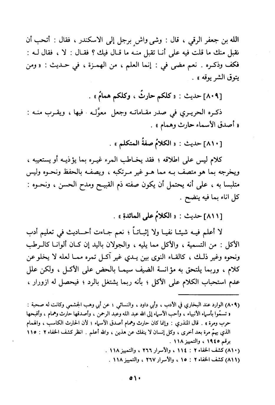 811 - حَدِيث: الْكَلامُ عَلَى الْمَائِدَةِ، لا أعلم فيه شيئا نفيا ولا إثباتا، نعم جاءت أحاديث في تعليم أدب الأكل من التسمية، والأكل مما يليه، والجولان باليد إن كان ألوانا، كالرطب ونحوه وغير ذلك، كإلقاء النوى بين يدي غير آكل تمره مما لعله لا يخلو عن كلام، وربما يلتحق به مؤانسة الضيف سيما بالحض على الأكل، ولكن علل عدم استحباب السلام على الأكل بأنه ربما يشتغل بالرد فيحصل له ازورار،