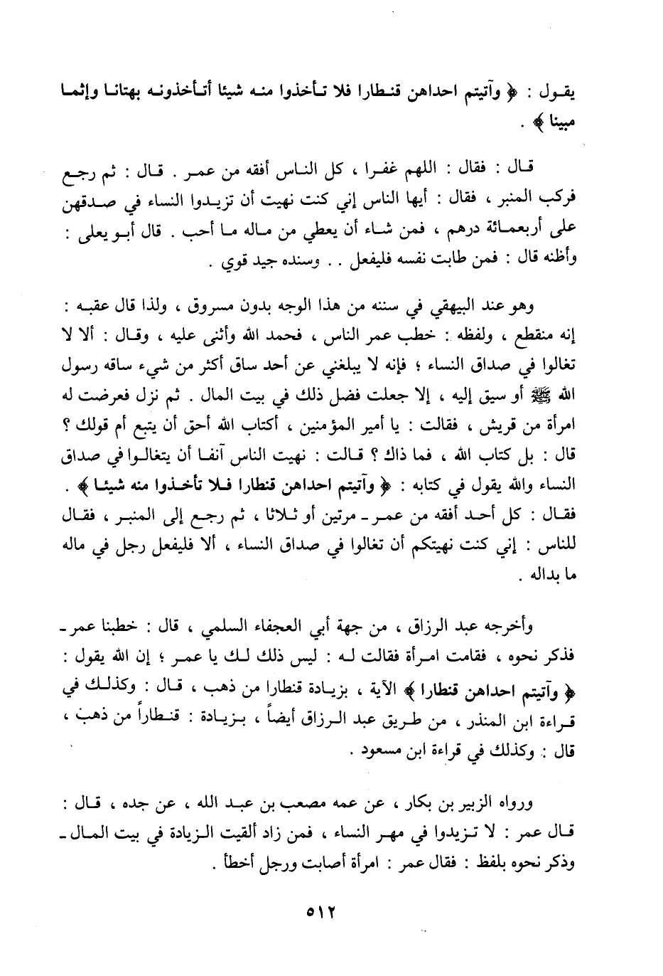 يقول {وَآتَيْتُمْ إِحْدَاهُنَّ قِنْطَارًا فَلا تَأْخُذُوا مِنْهُ شَيْئًا أَتَأْخُذُونَهُ بُهْتَانًا وَإِثْمًا مُبِينًا} قال: فقال: اللَّهم غفرا كل الناس أفقه من عمر، قال: ثم رجع فركب المنبر فقال: أيها الناس إني كنت نهيت أن تزيدوا النساء في صدقهن على أربعمائة درهم، فمن شاء أن يعطي من ماله ما أحب، قال أبو يعلى: وأظنه قال: فمن طابت نفسه فليفعل، وسنده جيد قوي. وهو عند البيهقي في سننه من هذا الوجه بدون مسروق، ولذا قال عقبه: إنه منقطع، ولفظه: خطب عمر الناس فحمد اللَّه وأثنى عليه وقال: ألا لا تغالوا في صداق النساء فإنه لا يبلغني عن أحد ساق أكثر من شيء ساقه رسول اللَّه صَلَّى اللَّهُ عَلَيْهِ وَسَلَّمَ أو سيق إليه إلا جعلت فضل ذلك في بيت المال، ثم نزل فعرضت له امرأة من قريش فقالت: يا أمير المؤمنين أكتاب اللَّه أحق أن يتبع أم قولك، قال: بل كتاب اللَّه فما ذاك قالت: نهيت الناس آنفا أن يتغالوا في صدق النساء واللَّه يقول في كتابه {وَآتَيْتُمْ إِحْدَاهُنَّ قِنْطَارًا فَلا تَأْخُذُوا مِنْهُ شَيْئًا} ، فقال: كل أحد أفقه من عمر مرتين أو ثلاثا، ثم رجع إلى المنبر فقال للناس: إني كنت نهيتكم أن تغالوا في صداق النساء ألا فليفعل رجل في ماله ما بدا له، وأخرجه عبد الرزاق من جهة أبي العجفاء السلمي قال: خطبنا عمر، فذكر نحوه، فقامت امرأة فقالت له: ليس ذلك لك يا عمر إن اللَّه يقول {وَآتَيْتُمْ إِحْدَاهُنَّ قِنْطَارًا} الآية، فقال: امرأة خاصمت عمر فخصمته، ورواه ابن المنذر من طريق عبد الرزاق أيضا بزيادة: قنطارا من ذهب، قال: وكذلك في قراءة ابن مسعود ورواه الزبير بن بكار عن عمه مصعب بن عبد اللَّه عن جده قال: قال عمر: لا تزيدوا في مهر النساء فمن زاد ألقيت الزيادة في بيت المال، وذكر نحوه، بلفظ: فقال عمر: امرأة أصابت ورجل أخطأ،