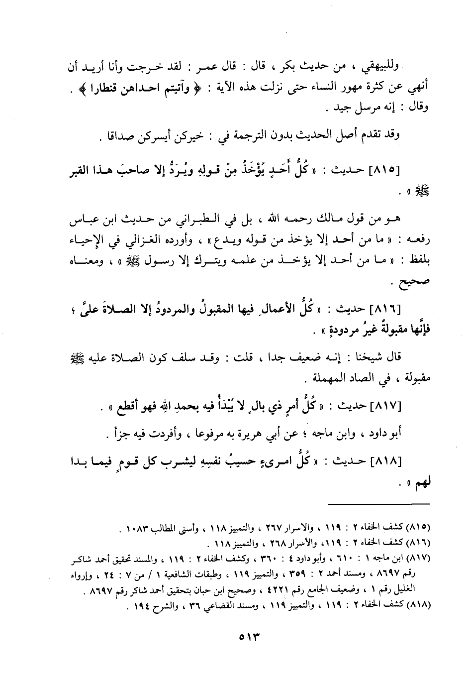 815 - حَدِيث: كُلُّ أَحَدٍ يُؤْخَذُ مِنْ قَوْلِهِ وَيُرَدُّ إِلا صَاحِبَ هَذَا الْقَبْرِ صَلَّى اللَّهُ عَلَيْهِ وَسَلَّمَ، هُوَ مِنْ قَوْلِ مَالِكٍ رَحِمَهُ اللَّه، بَلْ فِي الطَّبَرَانِيِّ مِنْ حَدِيثِ ابْنِ عَبَّاسٍ رَفَعَهُ: مَا مِنْ أَحَدٍ إِلا يُؤْخَذُ مِنْ قَوْلِهِ وَيَدَعُ، وأورده الغزالي في الإحياء بلفظ: ما من أحد إلا يؤخذ من علمه ويترك إلا رسول اللَّه صَلَّى اللَّهُ عَلَيْهِ وَسَلَّمَ، ومعناه صحيح.