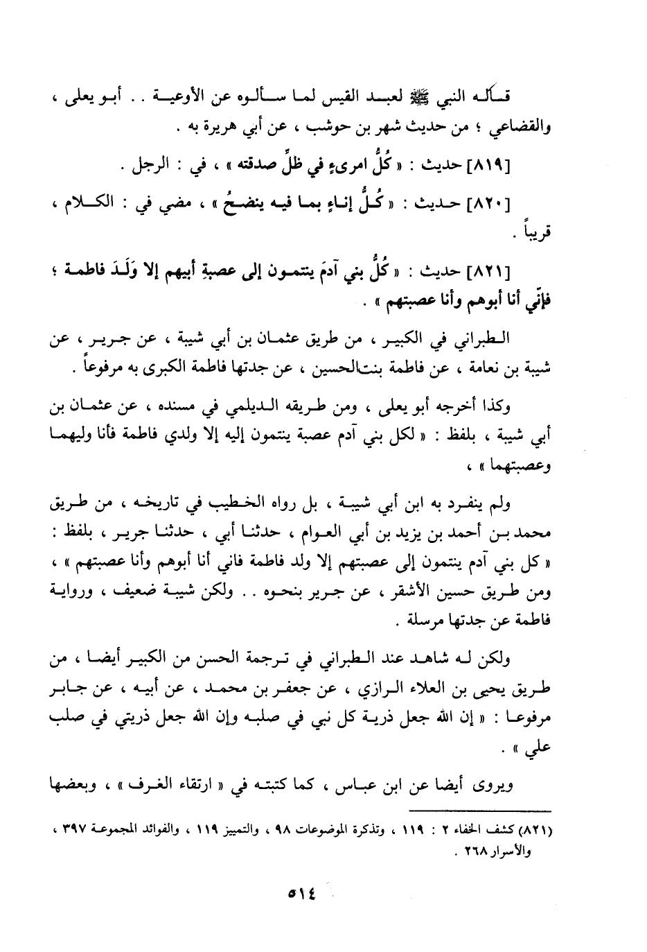 821 - حَدِيث: كُلُّ بَنِي آدَمَ يَنْتَمُونَ إِلَى عَصَبَةِ أَبِيهِمْ إِلا وَلَدَ فَاطِمَةَ، فَإِنِّي أَنَا أَبُوهُمْ وَأَنَا عَصَبَتُهُمْ، الطبراني في الكبير من طريق عثمان بن أبي شيبة عن جرير عن شيبة بن نعامة عن فاطمة ابنة الحسين عن جدتها فاطمة الكبرى به مرفوعا، وكذا أخرجه أبو يعلى ومن طريقه الديلمي في مسنده عن عثمان بن أبي شيبة بلفظ: لكل بني آدم عصبة ينتمون إليه إلا ولدي فاطمة فأنا وليهما وعصبتهما، ولم ينفرد به ابن أبي شيبة، بل رواه الخطيب في تاريخه من طريق محمد بن أحمد بن يزيد بن أبي العوام حدثنا أبي حدثنا جرير بلفظ: كل بني آدم ينتمون إلى عصبتهم إلا ولد فاطمة، فإني أنا أبوهم وأنا عصبتهم، ومن طريق حسين الأشقر عن جرير بنحوه، ولكن شيبة ضعيف، ورواية فاطمة عن جدتها مرسلة، ولكن له شاهد عند الطبراني في ترجمة الحسن من الكبير أيضا من طريق يحيى بن العلاء الرازي عن جعفر بن محمد عن أبيه عن جابر مرفوعا: إن اللَّه جعل ذرية كل نبي في صلبه، وإن اللَّه جعل ذريتي في صلب علي، ويروى أيضا عن ابن عباس كما كتبته في "ارتقاء الغرف" وبعضها