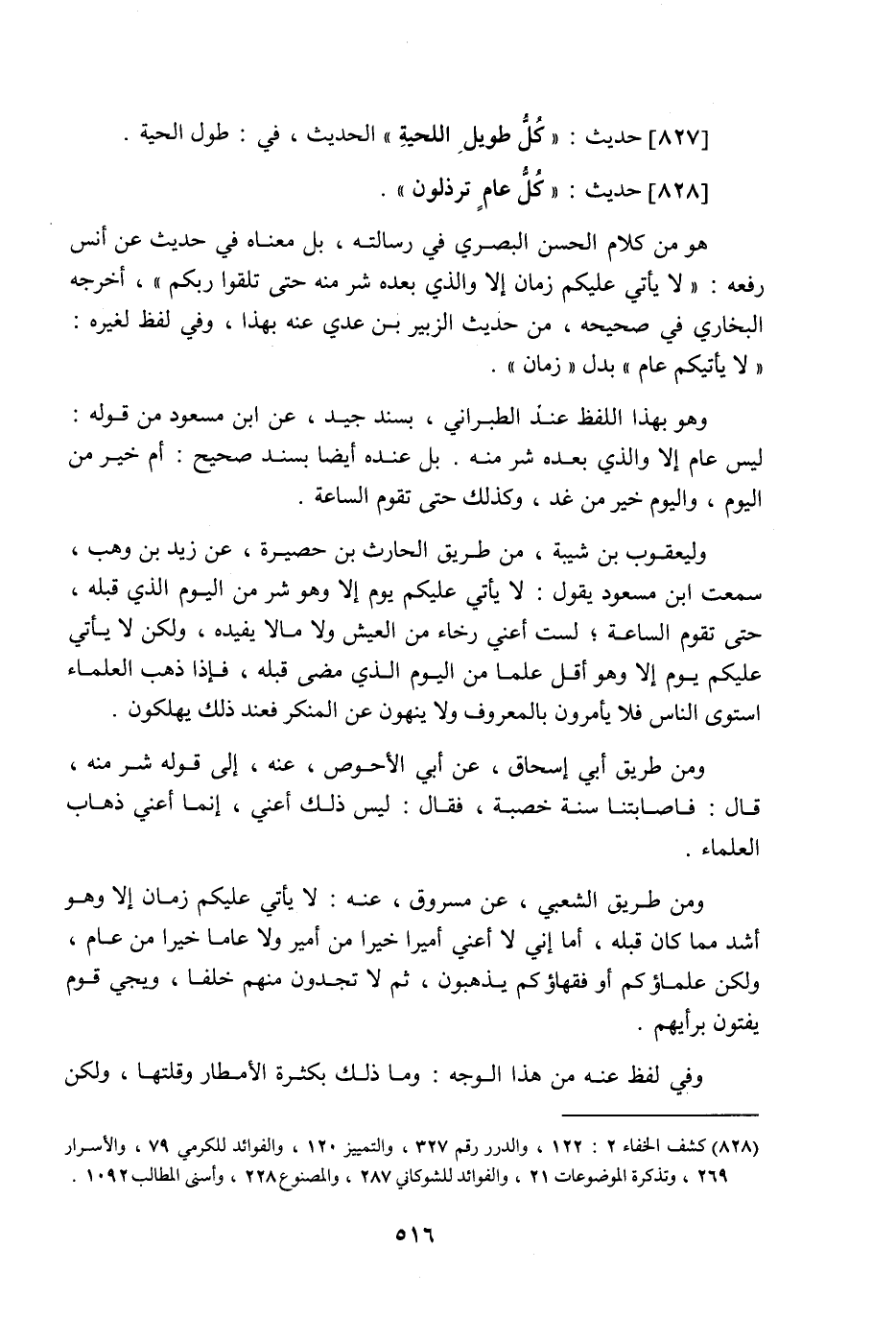 828 - حديث: كل عام ترذلون، هو من كلام الحسن البصري في رسالته، بل معناه في حديث عن أنس رفعه: لا يأتي عليكم زمان إلا والذي بعده شر منه حتى تلقوا ربكم، أخرجه البخاري في صحيحه من حديث الزبير ابن عدي عنه بهذا، وفي لفظ لغيره: لا يأتيكم عام، بدل زمان، وهو بهذا اللفظ عند الطبراني بسند جيد عن ابن مسعود من قوله: ليس عام إلا والذي بعده شر منه، بل عنده عنه أيضا بسند صحيح: أمس خير من اليوم، واليوم خير من غد، وكذلك حتى تقوم الساعة، وليعقوب بن شيبة من طريق الحارث بن حصيرة عن زيد بن وهب سمعت ابن مسعود يقول: لا يأتي عليكم يوم إلا وهو شر من اليوم الذي قبله حتى تقوم الساعة، لست أعني رخاء من العيش ولا مالا يفيده، ولكن لا يأتي عليكم يوم إلا وهو أقل علما من اليوم الذي مضى قبله، فإذا ذهب العلماء استوى الناس، فلا يأمرون بالمعروف ولا ينهون عن المنكر فعند ذلك يهلكون، ومن طريق أبي إسحاق عن أبي الأحوص عنه إلى قوله شر منه، قال: فأصابتنا سنة خصبة فقال: ليس ذلك أعني، إنما أعني ذهاب العلماء، ومن طريق الشعبي عن مسروق عنه: لا يأتي عليكم زمان إلا وهو أشد مما كان قبله، أما إني لا أعني أميرا خيرا من أمير ولا عاما خيرا من عام، ولكن علماؤكم أو فقهاؤكم يذهبون، ثم لا تجدون منهم خلفا، ويجيء قوم يفتون برأيهم، وفي لفظ عنه من هذا الوجه: وما ذلك بكثرة الأمطار وقلتها ولكن