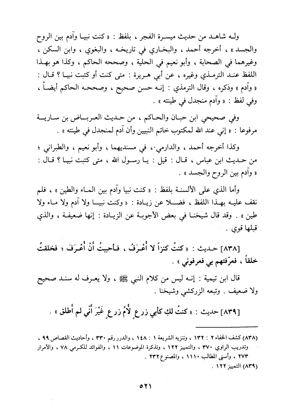 838 - حَدِيث: كُنْتُ كَنْزًا لا أُعْرَفُ، فَأَحْبَبْتُ أَنْ أُعْرَفَ فَخَلَقْتُ خَلْقًا، فَعَرَّفْتُهُمْ بِي فَعَرَفُونِي، قال ابن تيمية: إنه ليس من كلام النبي صَلَّى اللَّهُ عَلَيْهِ وَسَلَّمَ، ولا يعرف له سند صحيح ولا ضعيف، وتبعه الزركشي وشيخنا.