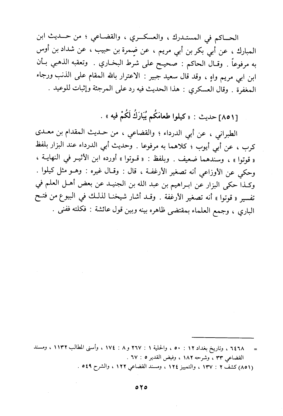 851 - حَدِيث: كِيلُوا طَعَامَكُمْ يُبَارَكْ لَكُمْ فِيهِ، الطبراني عن أبي الدرداء والقضاعي من حديث المقدام بن معدي كرب، عن أبي أيوب، كلاهما به مرفوعا، وحديث أبي الدرداء عند البزار بلفظ: قوتوا، وسندهما ضعيف، وبلفظ: وقوتوا، أورده ابن الأثير في النهاية، وحكى عن الأوزاعي أنه تصغير الأرغفة، قال: وقال غيره: وهو مثل كيلوا، وكذا حكى البزار عن إبراهيم بن عبد اللَّه بن الجنيد عن بعض أهل العلم في تفسير قوتوا أنه تصغير الأرغفة، وقد أشار شيخنا لذلك في البيوع من فتح الباري، وجمع العلماء بمقتضى ظاهره بينه وبين قول عائشة: فكلته ففني.