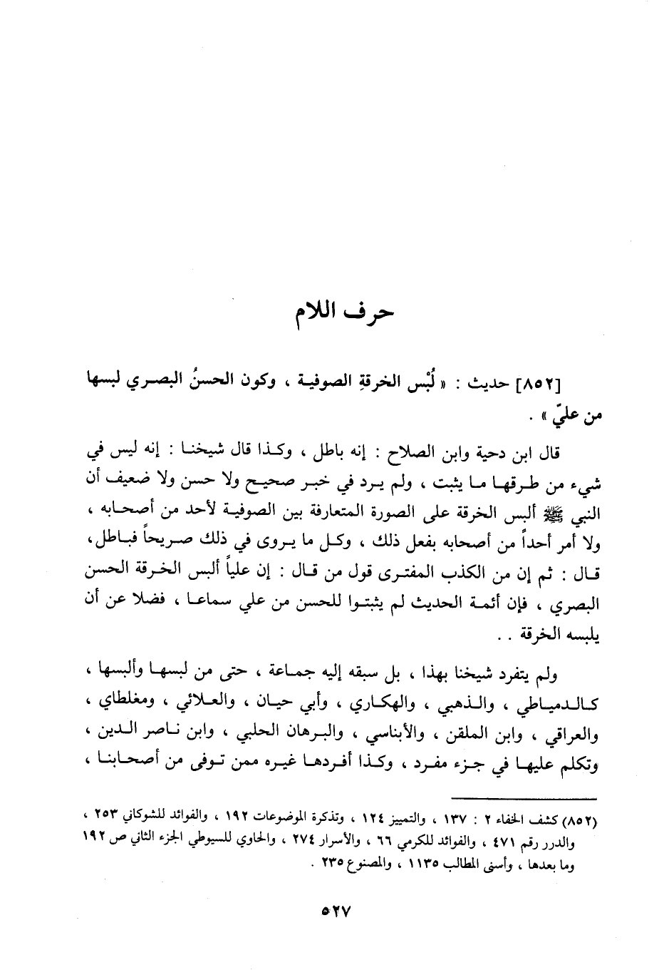 852 - حَدِيث: لُبْسُ الْخِرْقَةُ الصُّوفِيَّةِ، وكون الحسن البصري لبسها من علي، قال ابن دحية (*) وابن الصلاح: إنه باطل، وكذا قال شيخنا: إنه ليس في شيء من طرقها ما يثبت، ولم يرد في خبر صحيح، ولا حسن، ولا ضعيف، أن النبي صَلَّى اللَّهُ عَلَيْهِ وَسَلَّمَ ألبس الخرقة على الصورة المتعارفة بين الصوفية لأحد من أصحابه، ولا أمر أحدا من أصحابه يفعل ذلك، وكل ما يروى في ذلك صريحا فباطل، قال: ثم إن من الكذب المفترى قول من قال: إن عليا ألبس الخرقة الحسن البصري، فإن أئمة الحديث لم يثبتوا للحسن من علي سماعا فضلا عن أن يلبسه الخرقة، ولم يتفرد شيخنا بهذا، بل سبقه إليه جماعة حتى من لبسها وألبسها كالدمياطي والذهبي والهكاري وأبي حيان والعلائي ومغطاي والعراقي وابن الملقن والأبناسي والبرهان الحلبي وابن ناصر الدين، وتكلم عليها في جزء مفرد، وكذا أفردها غيره ممن توفي من أصحابنا،