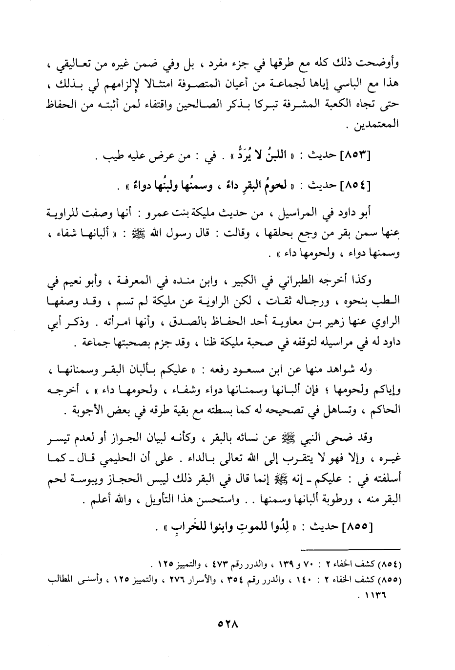 854 - حديث: لُحُومُ الْبَقَرِ دَاءٌ، وَسَمْنُهَا وَلَبَنُهَا دَوَاءٌ، أبو داود في المراسيل من حديث مليكة ابنة عمرو أنها وصفت للرواية عنها سمن بقر من وجع بحلقها، وقالت: قال رسول اللَّه صَلَّى اللَّهُ عَلَيْهِ وَسَلَّمَ: ألبانها شفاء، وسمنها دواء، ولحومها داء، وكذا أخرجه الطبراني في الكبير، وابن منده في المعرفة، وأبو نُعيم في الطب بنحوه، ورجاله ثقات، لكن الرواية عن مليكة لم تسم، وقد وصفها الراوي عنها زهير ابن معاوية أحد الحفاظ بالصدق، وأنها امرأته، وذكر أبي داود له في مراسيله لتوقفه في صحبة مليكة ظنا، وقد جزم بصحتها جماعة، وله شواهد منها عن ابن مسعود رفعه: عليكم بألبان البقر وسمنانها، وإياكم ولحومها، فإن ألبانها وسمنانها دواء وشفاء، ولحومها داء، أخرجه الحاكم وتساهل في تصحيحه له، كما بسطته مع بقية طرقه في بعض الأجوبة، وقد ضحى النبي صَلَّى اللَّهُ عَلَيْهِ وَسَلَّمَ عن نسائه بالبقر، وكأنه لبيان الجواز أو لعدم تيسر غيره، وإلا فهو لا يتقرب إلى اللَّه تعالى بالداء، على أن الحليمي قال كما أسلفته في: عليكم، إنه صَلَّى اللَّهُ عَلَيْهِ وَسَلَّمَ إنما قال في البقر ذلك ليبس الحجاز ويبوسة لحم البقر منه، ورطوبة ألبانها وسمنها، واستحسن هذا التأويل، واللَّه أعلم.