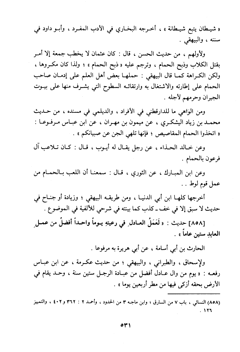 شيطان يتبع شيطانة، أخرجه البخاري في الأدب المفرد، وأبو داود في سننه، والبيهقي، ولأولهم من حديث الحسن قال: كان عثمان لا يخطب جمعة إلا أمر بقتل الكلاب وذبح الحمام، وترجم عليه: ذبح الحمام، ولذا كان مكروها، ولكن الكراهة كما قال البيهقي حملها بعض أهل العلم على إدمان صاحب الحمام على إطارته، والاشتغال به، وارتقائه السطوح التي يشرف منها على بيوت الجيران وحرمهم لأجله، ومن الواهي ما للدارقطني في الأفراد، والديلمي في مسنده، من حديث محمد بن زياد اليشكري عن ميمون بن مهران عن ابن عباس مرفوعا: اتخذوا الحمام المقاصيص، فإنها تلهى الجن عن صبيانكم، وعن خالد الحذاء عن رجل يقال له أيوب، قال: كان تلاعب آل فرعون بالحمام، وعن ابن المبارك عن الثوري قال: سمعنا أن اللعب بالحمام من عمل قوم لوط، أخرجها كلها ابن أبي الدنيا، ومن طريقه البيهقي وزيادة أو جناح في حديث: لا سبق إلا في خف، كذب كما بينته في شرحي للألفية في الموضوع.