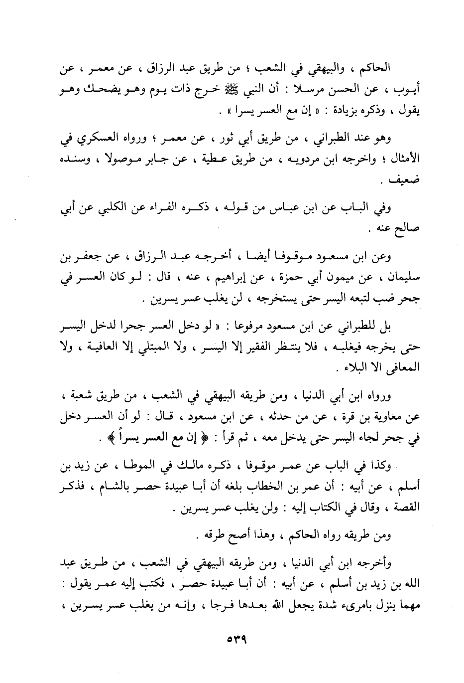 الحاكم والبيهقي في الشعب، من طريق عبد الرزاق عن معمر عن أيوب عن الحسن مرسلا، أن النبي صَلَّى اللَّهُ عَلَيْهِ وَسَلَّمَ خرج ذات يوم وهو يضحك، وهو يقول: وذكره، بزيادة: "إن مع العسر يسرا" وهو عند الطبراني من طريق أبي ثور عن معمر، ورواه العسكري في الأمثال، وأخرجه ابن مردويه من طريق عطية عن جابر موصولا وسنده ضعيف، وفي الباب عن ابن عباس من قوله، ذكره الفراء عن الكلبي عن أبي صالح عنه، وعن ابن مسعود موقوفا أيضا أخرجه عبد الرزاق عن جعفر بن سليمان عن ميمون أبي حمزة عن إبراهيم عنه قال: لو كان العسر في جحر ضب لتبعه اليسر حتى يستخرجه، لن يغلب عسر يسرين، بل للطبراني عن ابن مسعود مرفوعا: لو دخل العسر جحرا لدخل اليسر حتى يخرجه فيغلبه، فلا ينتظر الفقير إلا اليسر، ولا المبتلى إلا العافية، ولا المعافى إلا البلاء، ورواه ابن أبي الدنيا ومن طريقه البيهقي في الشعب من طريق شعبة عن معاوية بن قرة عمن حدثه عن ابن مسعود قال: لو أن العسر دخل في جحر لجاء اليسر حتى يدخل معه ثم قرأ {إِنَّ مَعَ الْعُسْرِ يُسْرًا} ، وكذا في الباب عن عمر موقوفا، ذكره مالك في الموطأ عن زيد بن أسلم عن أبيه أن عمر بن الخطاب بلغه أن أبا عبيدة حصر بالشام، فذكر القصة وقال في الكتاب إليه: ولن يغلب عسر يسرين، ومن طريقه رواه الحاكم وهذا أصح طرقه، وأخرجه ابن أبي الدنيا ومن طريقه البيهقي في الشعب من طريق عبد اللَّه بن زيد بن أسلم عن أبيه أن أبا عبيدة حصر فكتب إليه عمر يقول: مهما ينزل بامرئ شدة يجعل اللَّه بعدها فرجا، وإنه لن يغلب عسر يسرين،