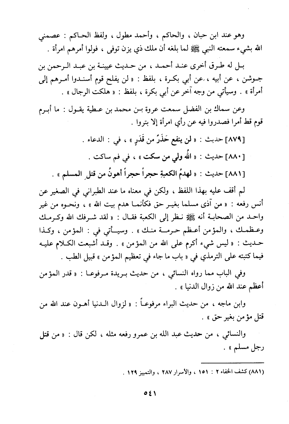 881 - حَدِيث: لَهَدْمُ الْكَعْبَةِ حَجَرًا حَجَرًا أَهْوَنُ مِنْ قَتْلِ الْمُسْلِمِ، لم أقف عليه بهذا اللفظ، ولكن في معناه ما عند الطبراني في الصغير عن أنس رفعه: من آذى مسلما بغير حق فكأنما هدم بيت اللَّه، ونحوه من غير واحد من الصحابة أنه صَلَّى اللَّهُ عَلَيْهِ وَسَلَّمَ نظر إلى الكعبة فقال: لقد شرفك اللَّه وكرمك وعظمك، والمؤمن أعظم حرمة منك، وسيأتي في: المؤمن، وكذا حديث: ليس شيء أكرم على اللَّه من المؤمن، وقد أشبعت الكلام عليه فيما كتبته على الترمذي في: باب ما جاء في تعظيم المؤمن، قبيل الطب. وفي الباب مما رواه النسائي من حديث بريدة مرفوعا: قدر المؤمن أعظم عند اللَّه من زوال الدنيا، وابن ماجه من حديث البراء مرفوعا: لزوال الدنيا أهون عند اللَّه من قتل مؤمن بغير حق، والنسائي من حديث عبد اللَّه بن عمرو رفعه مثله، لكن قال: من قتل رجل مسلم،