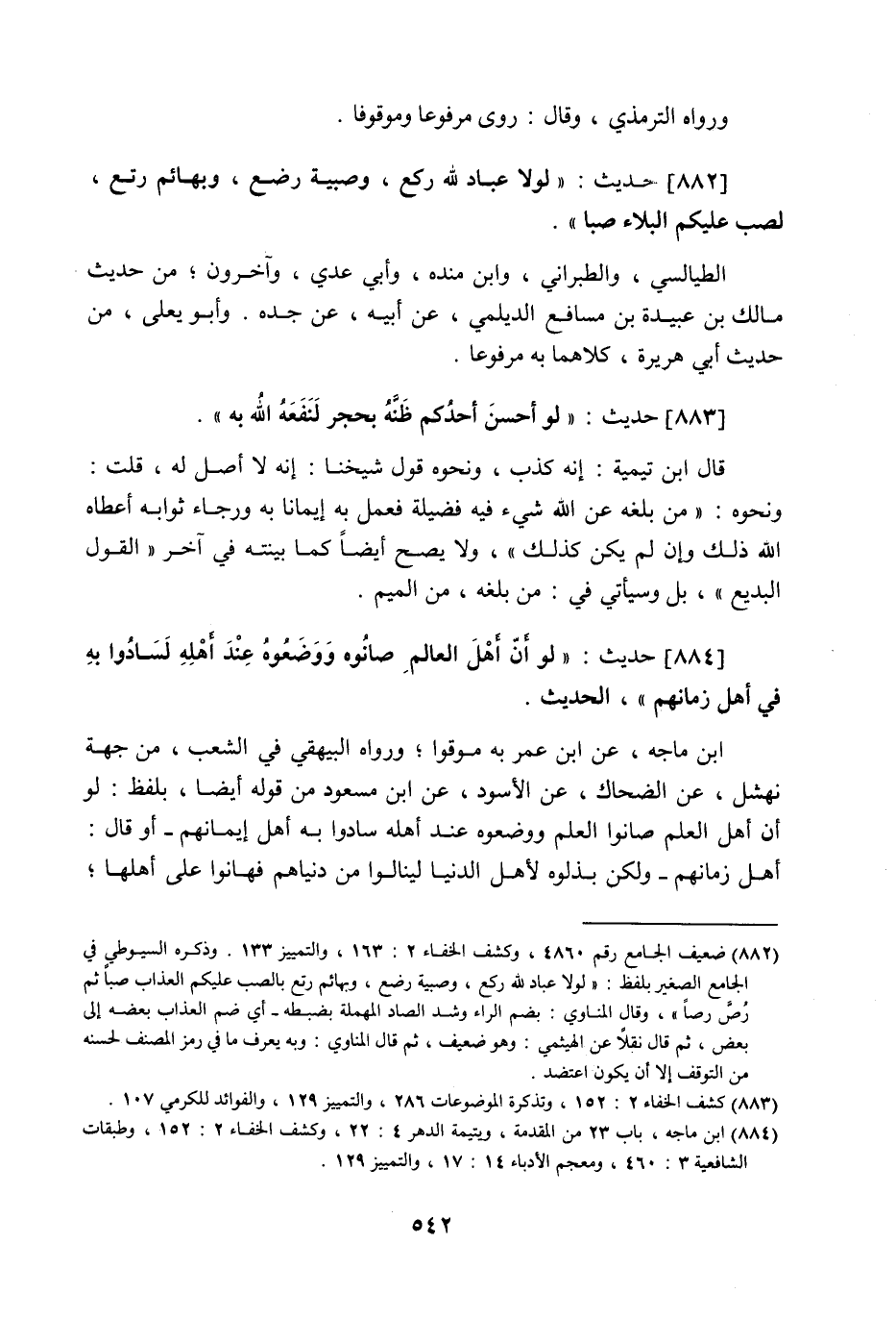 883 - حَدِيث: لَوْ أَحْسَنَ أَحَدُكُمْ ظَنَّهُ بِحَجَرٍ لَنَفَعَهُ اللَّه بِهِ، قال ابن تيمية: إنه كذب، ونحوه قول شيخنا: لا أصل له، قلت: ونحوه، من بلغه عن اللَّه شيء فيه فضيلة فعمل به إيمانا به ورجاء ثوابه أعطاه اللَّه ذلك وإن لم يكن كذلك، ولا يصح أيضا كما بينته في آخره القول البديع، بل وسيأتي في: من بلغه، من الميم.
