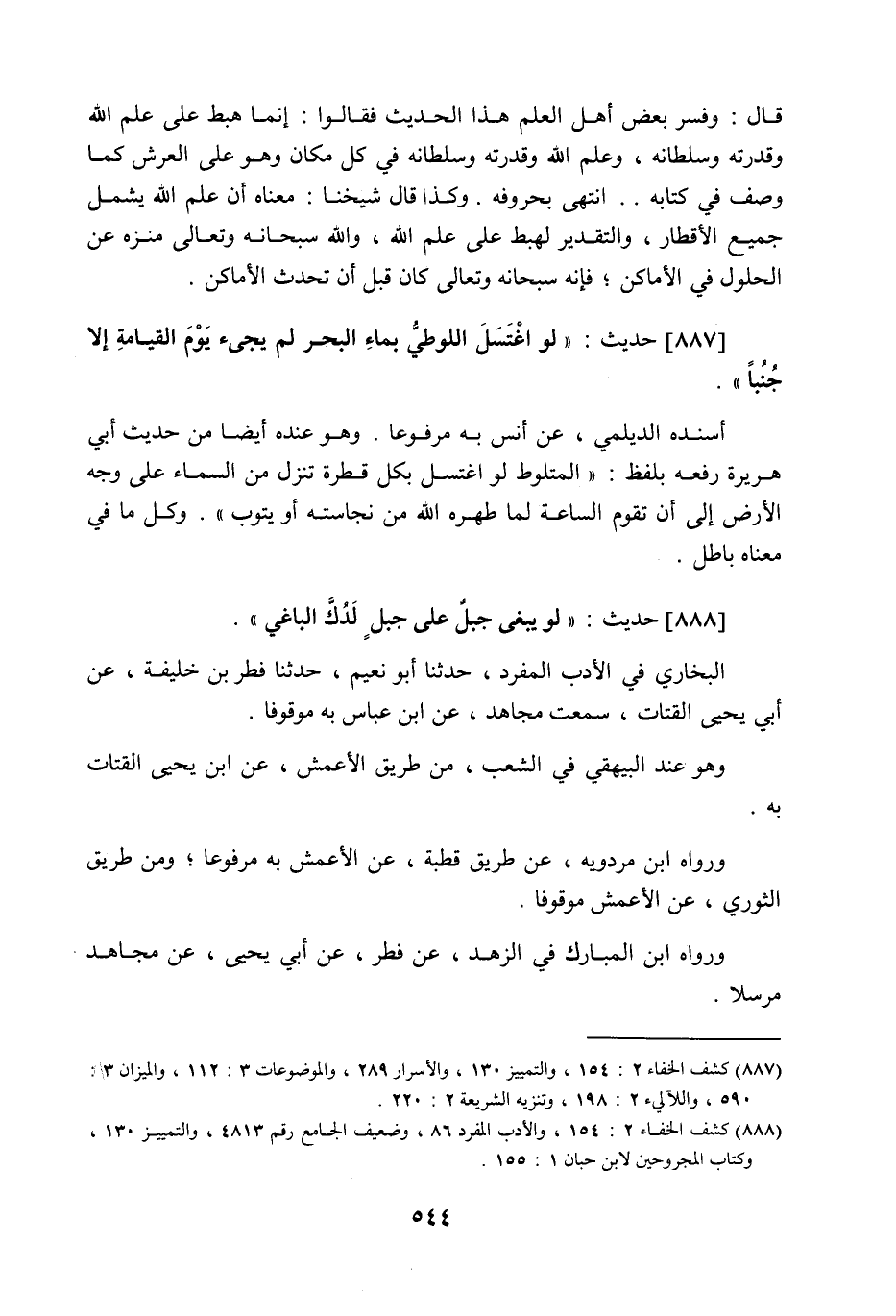 888 - حَدِيث: لَوْ يَبْغِي جَبَلٌ عَلَى جَبَلٍ لَدُكَّ الْبَاغِي، البخاري في الأدب المفرد حدثنا أبو نُعيم حدثنا فطر بن خليفة عن أبي يحيى القتات سمعت مجاهدا عن ابن عباس به موقوفا، وهو عند البيهقي في الشعب من طريق الأعمش عن ابن يحيى القتات به، ورواه ابن مردويه عن طريق قطبة عن الأعمش به مرفوعا، ومن طريق الثوري عن الأعمش موقوفا، ورواه ابن المبارك في الزهد عن فطر عن أبي يحيى عن مجاهد مرسلا،