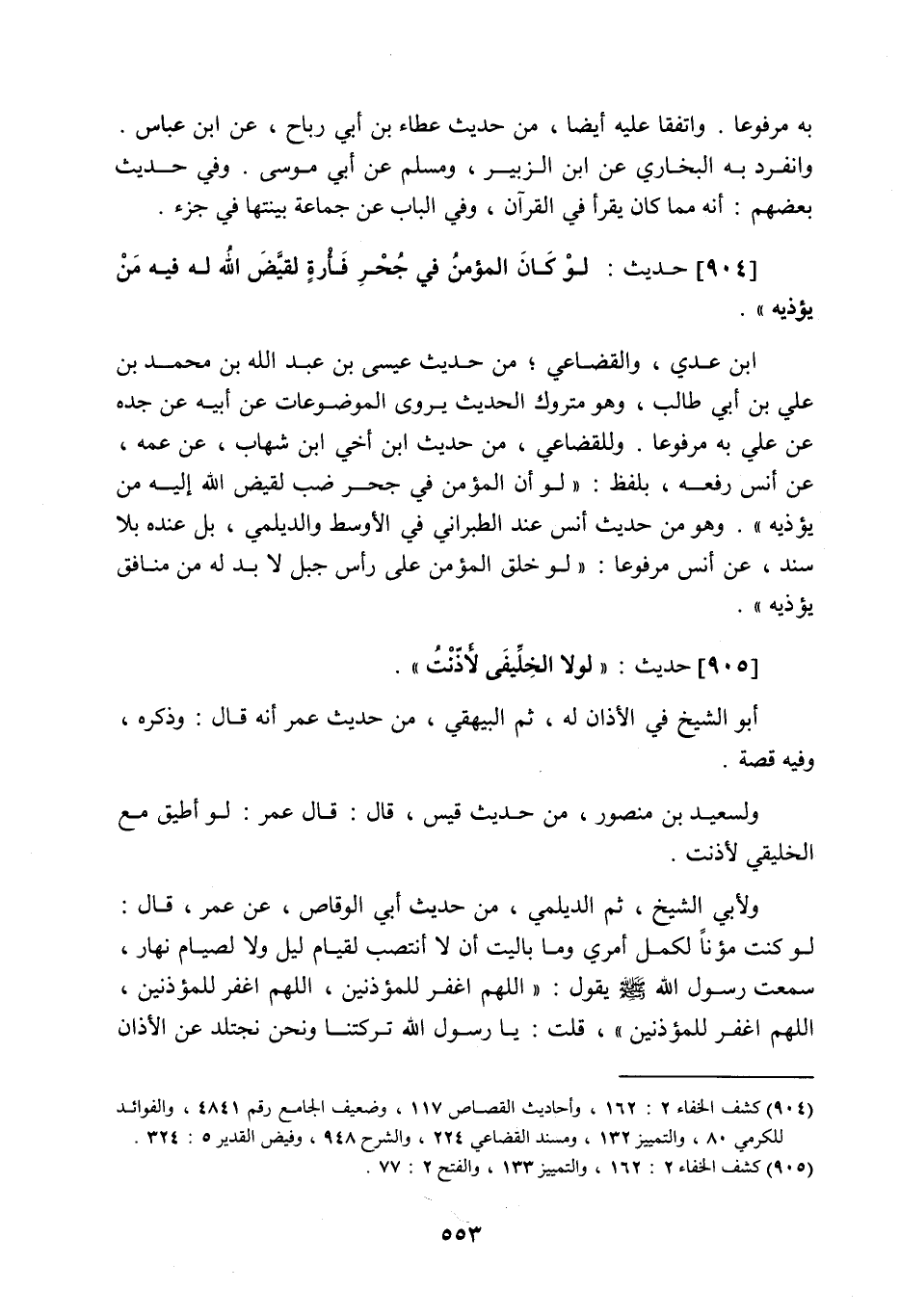 905 - حديث: لَوْلا الْخِلِّيفَى لأَذَّنْتُ، أبو الشيخ في الأذان له ثم البيهقي من حديث عمر أنه قال: وذكره، وفيه قصة، ولسعيد بن منصور من حديث قيس قال: قال عمر: لو أطيق مع الخليفى لأذنت، الشيخ ثم الديلمي من حديث أبي الوقاص عن عمر قال: لو كنت مؤذنا لكل أمري وما باليت أن لا أنتصب لقيام ليل ولا لصيام نهار، سمعت رسول اللَّه صَلَّى اللَّهُ عَلَيْهِ وَسَلَّمَ يقول: اللَّهم اغفر للمؤذنين اللَّهم اغفر للمؤذنين اللَّهم اغفر للمؤذنين، قلت: يا رسول اللَّه تركتنا ونحن نجتلد عن الأذان