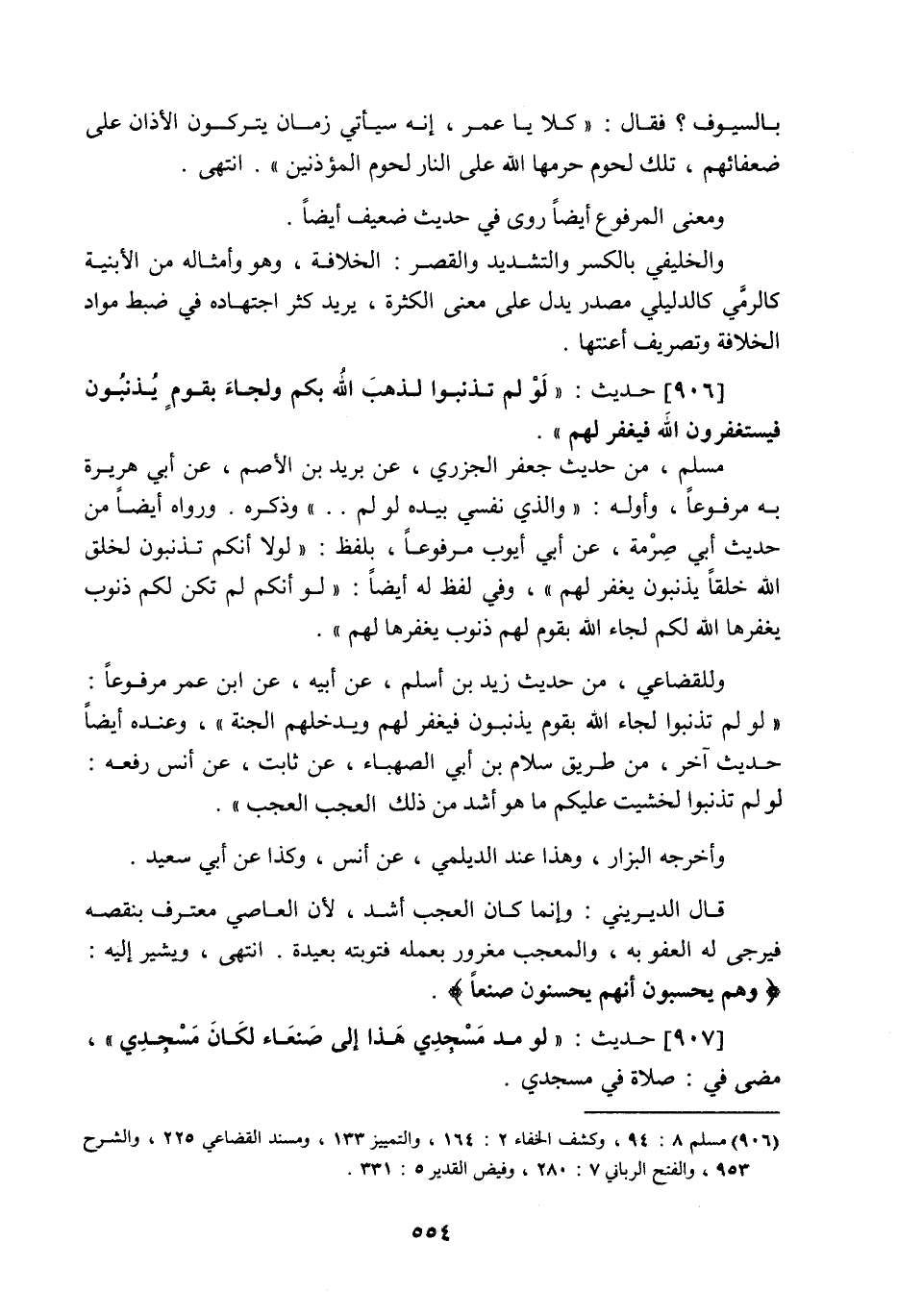 906 - حَدِيث: لَوْ لَمْ تُذْنِبُوا لَذَهَبَ اللَّه بِكُمْ وَلَجَاءَ بِقَوْمٍ يُذْنِبُونَ فَيَسْتَغْفِرُونَ اللَّه فَيَغْفِرُ لَهُمْ، مسلم من حديث جعفر الجزري عن يزيد بن الأصم عن أبي هريرة به مرفوعا: وأوله: والذي نفسي بيده لو لم، وذكره، ورواه أيضا من حديث أبي صِرْمة عن أبي أيوب مرفوعا بلفظ: لولا أنكم تذنبون لخلق اللَّه خلقا يذنبون يغفر لهم، وفي لفظ له أيضا: لو أنكم لم تكن لكم ذنوب يغفرها اللَّه لكم لجاء اللَّه بقوم لهم ذنوب يغفرها لهم، وللقضاعي من حديث زيد بن أسلم عن أبيه عن ابن عمر مرفوعا: لو لم تذنبوا لجاء اللَّه بقوم يذنبون فيغفر لهم ويدخلهم الجنة، وعنده أيضا حديث آخر من طريق سلام بن أبي الصهباء عن ثابت عن أنس رفعه: لو لم تذنبوا لخشيت عليكم ما هو أشد من ذلك، العجب العجب، وأخرجه البزار، وهذا عند الديلمي عن أنس وكذا عن أبي سعيد، قال الديريني: وإنما كان العجب أشد لأن العاصي معترف بنقصه فيرجى له العفو به، والمعجب مغرور بعمله فتوبته بعيدة انتهى، ويشير إليه {وَهُمْ يَحْسَبُونَ أَنَّهُمْ يُحْسِنُونَ صُنْعًا} .