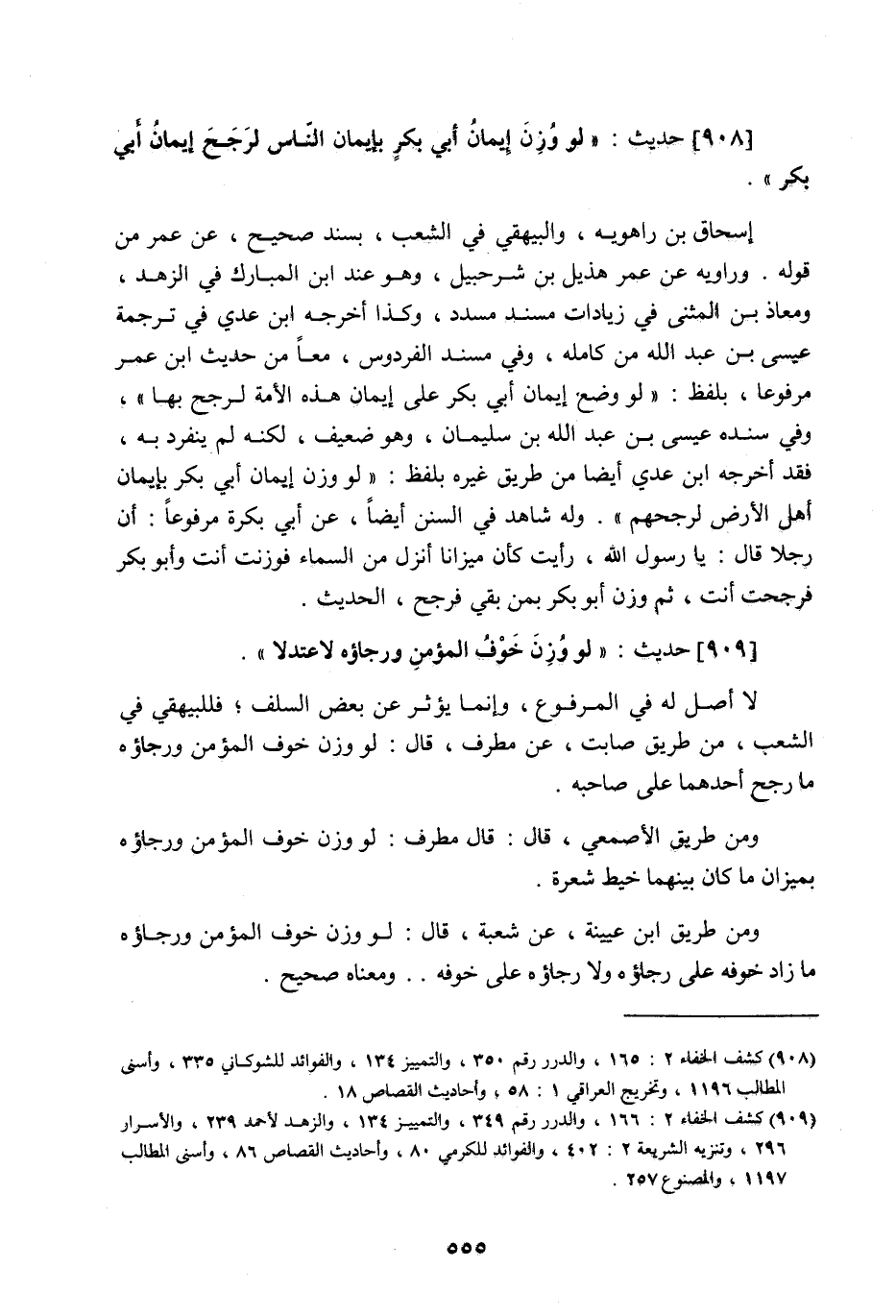 908 - حَدِيث: لَوْ وُزِنَ إِيمَانُ أَبِي بَكْرٍ بِإِيمَانِ النَّاسِ لَرَجَحَ إِيمَانُ أَبِي بَكْرٍ، إسحاق بن راهويه والبيهقي في الشعب بسند صحيح عن عمر من قوله، وراويه عن عمر هذيل بن شرحبيل، وهو عند ابن المبارك في الزهد ومعاذ ابن المثنى في زيادات مسند مسدد، وكذا أخرجه ابن عدي في ترجمة عيسى ابن عبد اللَّه من كامله، وفي مسند الفردوس معا من حديث ابن عمر مرفوعا بلفظ: لو وضع إيمان أبي بكر على إيمان هذه الأمة لرجح بها، وفي سنده عيسى ابن عبد اللَّه بن سليمان وهو ضعيف، لكنه لم ينفرد به، فقد أخرجه ابن عدي أيضا من طريق غيره: لو وزن إيمان أبي بكر بإيمان أهل الأرض لرجحهم، وله شاهد في السنن أيضا عن أبي بكرة مرفوعا: أن رجلا قال: يا رسول اللَّه رأيت كأن ميزانا أنزل من السماء فوزنت أنت وأبو بكر فرجحت أنت، ثم وزن أبو بكر بمن بقي فرجح، الحديث.