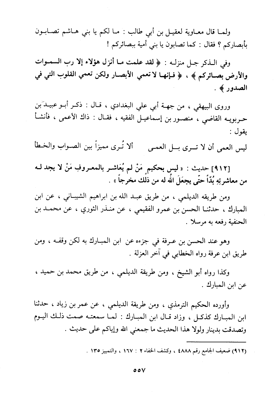 912 - حَدِيث: لَيْسَ بِحَكِيمٍ مَنْ لَمْ يُعَاشِرْ بِالْمَعْرُوفِ من لا بد لَهُ من معاشرته بد حَتَّى يَجْعَلَ اللَّه لَهُ مِنْ ذَلِكَ مَخْرَجًا، الحاكم ومن طريقه الديلمي، من طريق عبد اللَّه بن إبراهيم الشيباني عن ابن المبارك حدثنا الحسن بن عمرو الفقيمي عن منذر الثوري عن محمد بن الحنفية رفعه به مرسلا، وهو عند الحسن بن عرفة في جزئه عن ابن المبارك به لكن وقفه، ومن طريق ابن عرفة رواه الخطابي في آخر العزلة، وكذا رواه أبو الشيخ، ومن طريقه الديلمي، من طريق محمد بن حميد عن ابن المبارك، وأورده الحكيم الترمذي، ومن طريقه الديلمي، عن عمر بن زياد حدثنا ابن المبارك كذلك، وزاد قال ابن المبارك: لما سمعته صمت ذلك اليوم، وتصدقت بدينار، ولولا هذا الحديث ما جمعني اللَّه وإياكم على حديث،