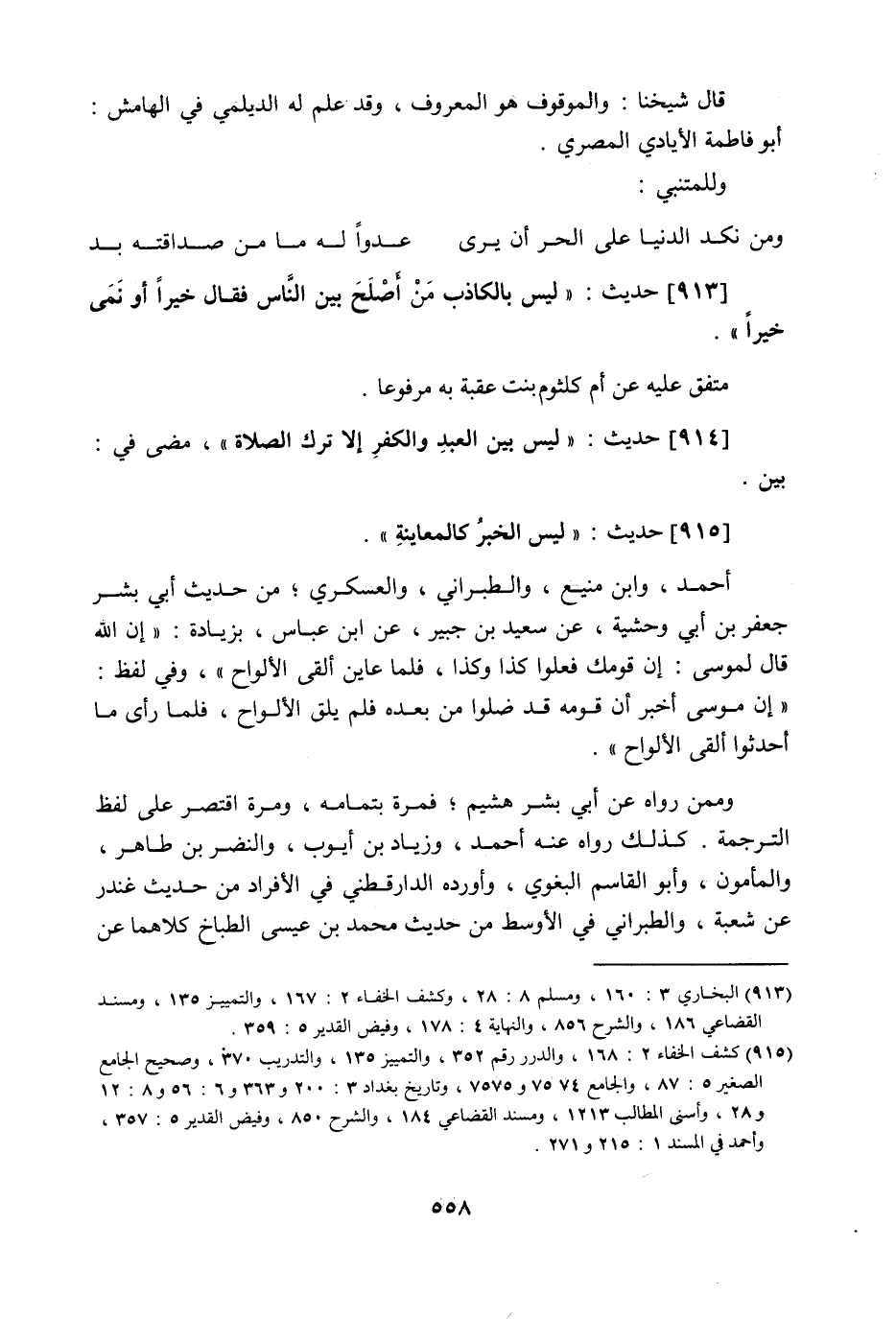 913 - حديث: لَيْسَ بِالْكَاذِبِ مَنْ أَصْلَحَ بَيْنَ النَّاسِ فَقَالَ خَيْرًا أَوْ نَمَى خَيْرًا، متفق عليه من أم كلثوم ابنة عقبة به مرفوعا.