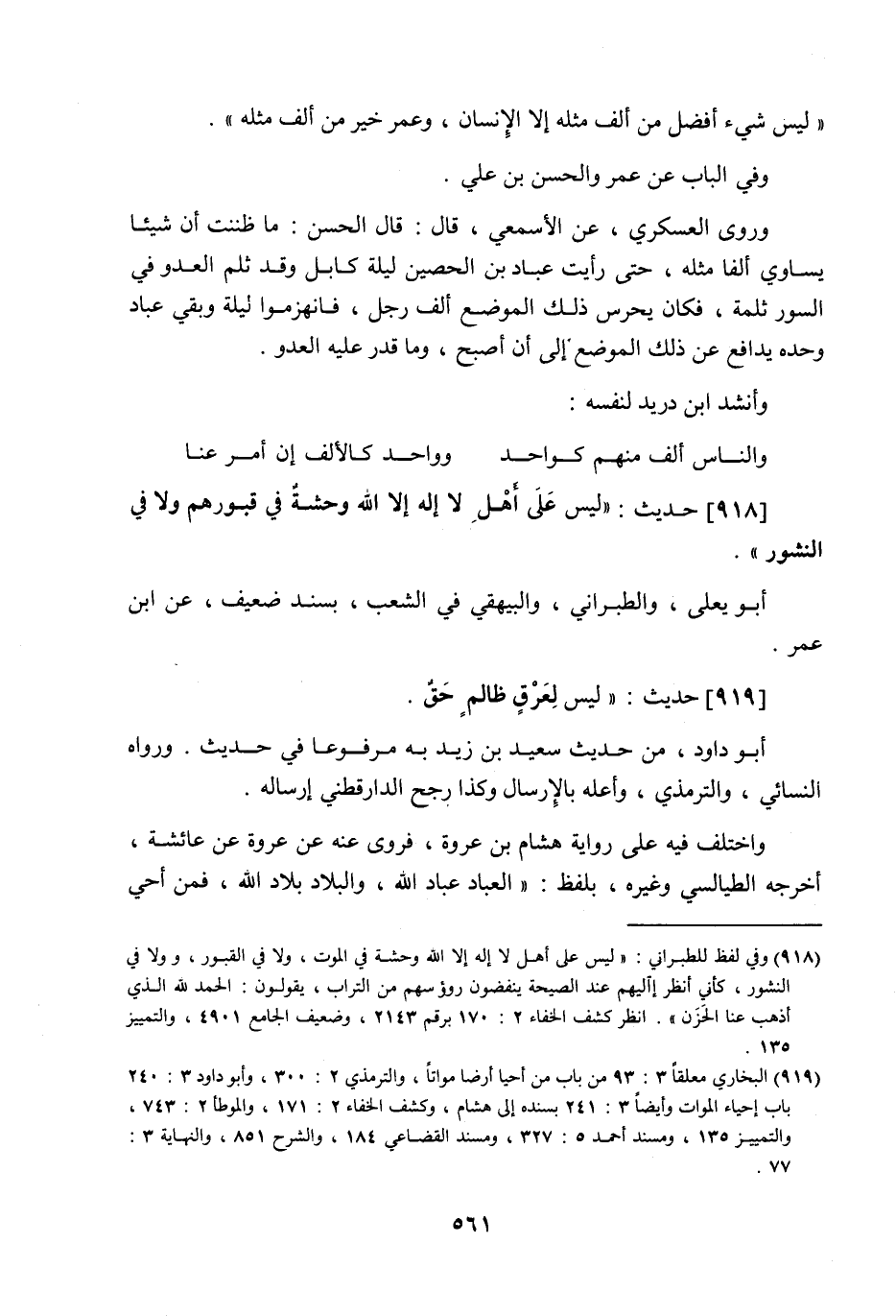ليس شيء أفضل من ألف مثله إلا الإنسان، وعمر خير من ألف مثله، وفي الباب عن عمر، والحسن بن علي، وروى العسكري عن الأصمعي قال: قال الحسن: ما ظننت أن شيئا يساوي ألفا مثله حتى رأيت عباد بن الحصين ليلة كابل، وقد ثلم العدو في السور ثلمة فكأن يحرس ذلك الموضع ألف رجل، فانهزموا ليلة، وبقي عباد وحده يدافع عن ذلك الموضع إلى أن أصبح وما قدر عليه العدو، وأنشد ابن دريد لنفسه: