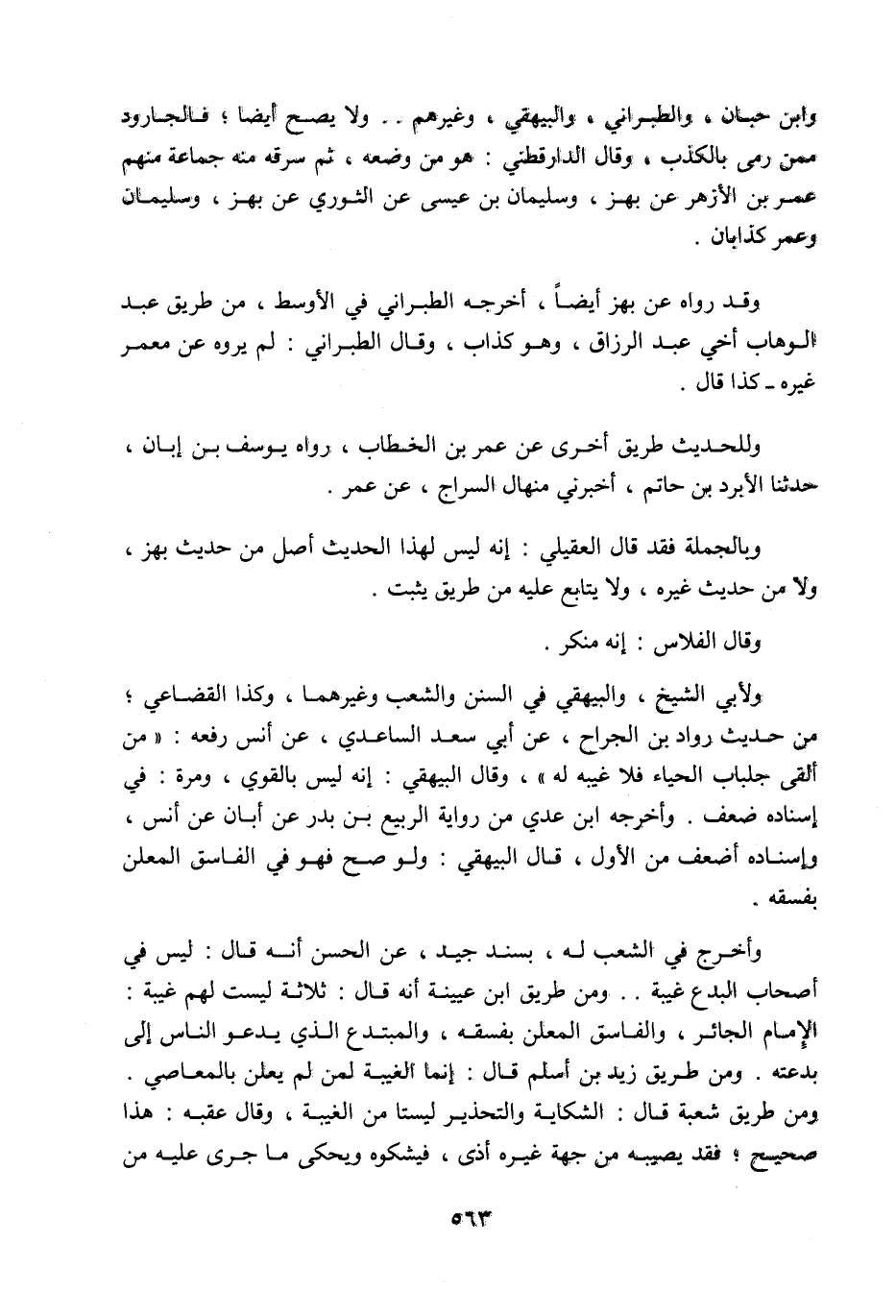 وابن حبان، والطبراني، والبيهقي، وغيرهم، ولا يصح أيضا، فالجارود ممن رمي بالكذب، وقال الدارقطني: هو من وضعه، ثم سرقه منه جماعة، منهم عمر بن الأزهر عن بهز، وسليمان بن عيسى عن الثوري عن بهز، وسليمان وعمر كذابان، وقد رواه معمر عن بهز أيضا أخرجه الطبراني في الأوسط من طريق عبد الوهاب أخي عبد الرزاق وهو كذاب، وقال الطبراني: لم يروه عن معمر غيره كذا قال، وللحديث طريق أخرى عن عمر بن الخطاب رواه يوسف بن أبان حدثنا الأبرد بن حاتم أخبرني منهال السراج عن عمر، وبالجملة فقد قال العقيلي: إنه ليس لهذا الحديث أصل من حديث بهز ولا من حديث غيره ولا يتابع عليه من طريق يثبت، وقال الفلاس: إنه منكر، ولأبي الشيخ والبيهقي في السنن والشعب وغيرهما وكذا القضاعي، من حديث رواد بن الجراح عن أبي سعد الساعدي عن أنس رفعه: من ألقى جلباب الحياء فلا غيبة له، وقال البيهقي: إنه ليس بالقوي، ومرة: في إسناده ضعف، وأخرجه ابن عدي من رواية الربيع بن بدر عن أبان عن أنس، وإسناده أضعف من الأول، قال البيهقي: ولو صح فهو في الفاسق المعلن بفسقه، وأخرج في الشعب له بسند جيد عن الحسن أنه قال: ليس في أصحاب البدع غيبة، ومن طريق ابن عيينة أنه قال: ثلاثة ليست لهم غيبة الإمام الجائر، والفاسق المعلن بفسقه، والمبتدع الذي يدعو الناس إلى بدعته، ومن طريق زيد بن أسلم قال: إنما الغيبة لمن لم يعلن بالمعاصي، ومن طريق شعبة قال: الشكاية والتحذير ليستا من الغيبة، وقال عقبة: هذا صحيح، فقد يصيبه من جهة غيره أذى فيشكوه، ويحكي ما جرى عليه من